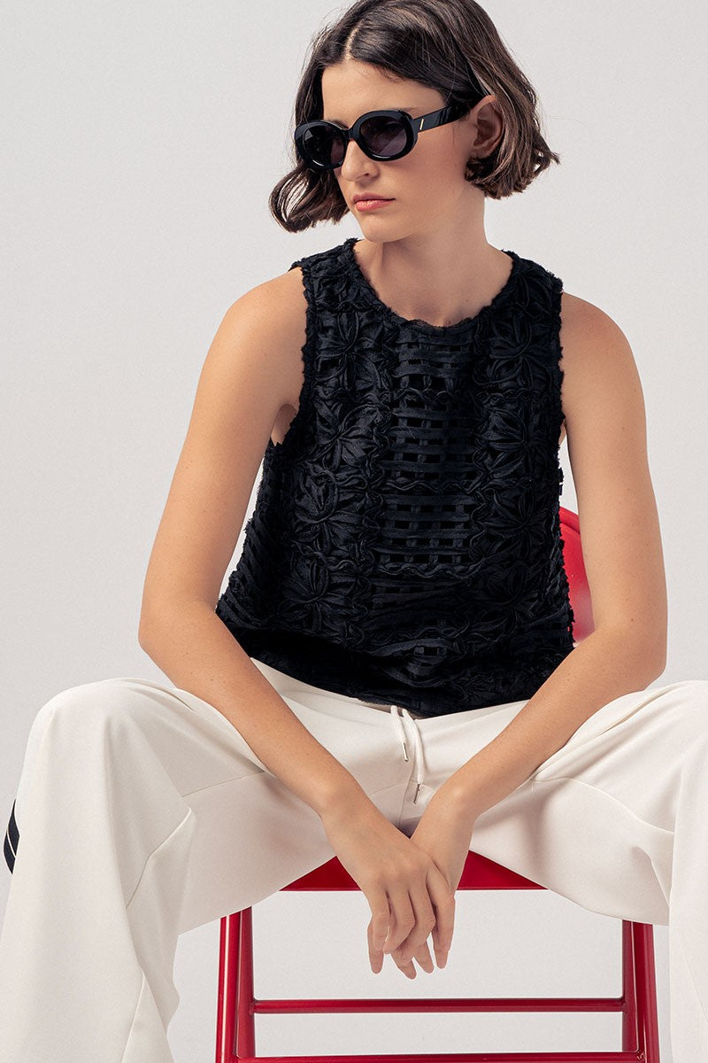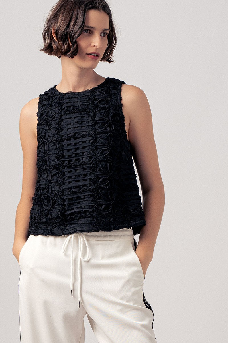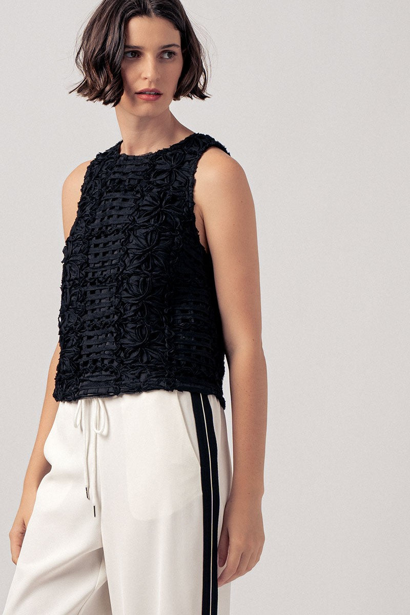 Art you can wear. This vintage couture-inspired top is a stunning statement piece that effortlessly blends texture, craftsmanship, and feminine charm. Featuring an intricate open weave fabric with delicate floral petal detailing throughout, this top is truly one of a kind. The relaxed, structured silhouette and sleeveless design make it versatile enough to dress up or down. Style it with tailored trousers, a pleated maxi skirt, and heels for an elevated evening look - or pair it with your favorite denim for an effortlessly chic daytime outfit.