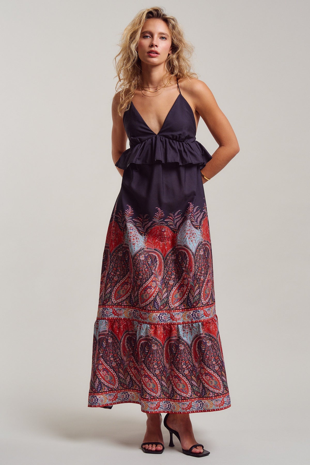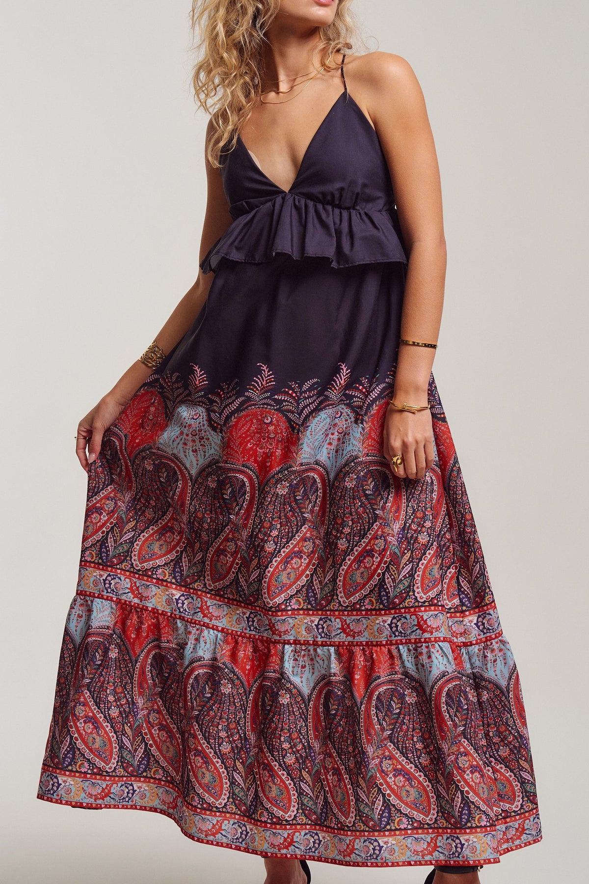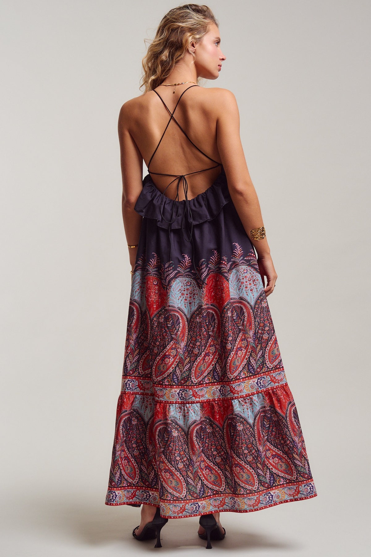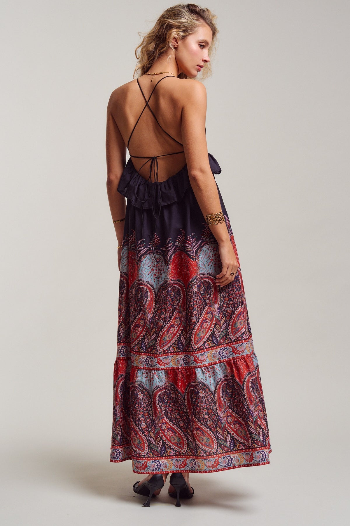All eyes on you! with this ultimate boho sunset-ready dress. A deep V-neckline with a flirty ruffle peplum flows into a sweeping maxi skirt in rich crimson, dusty blue, and midnight navy paisley. Delicate cross-back straps with an adjustable tie add just the right amount of allure. Pair it with flat sandals for sun-soaked summer beach days, or heels and gold for warm evening nights.