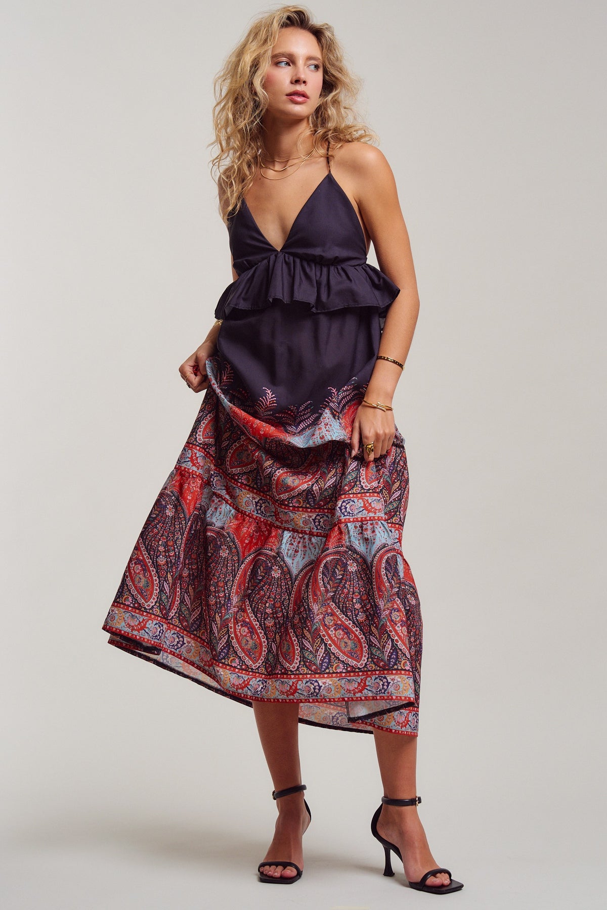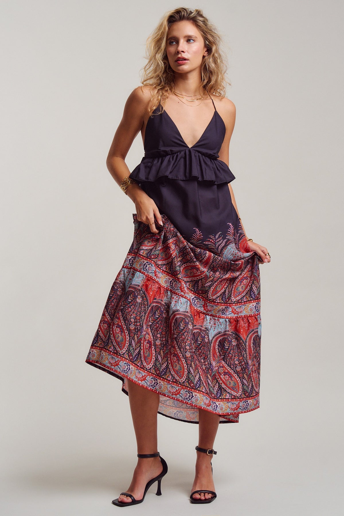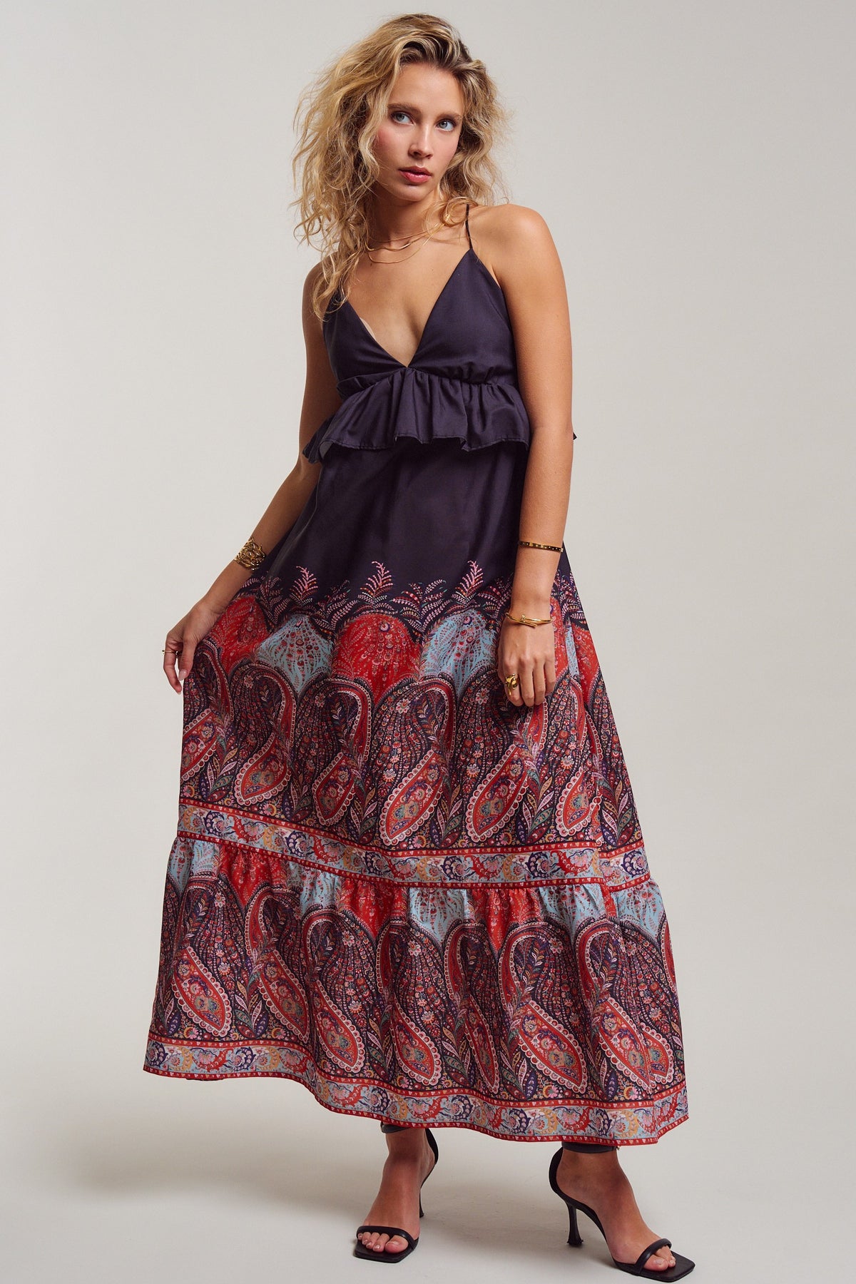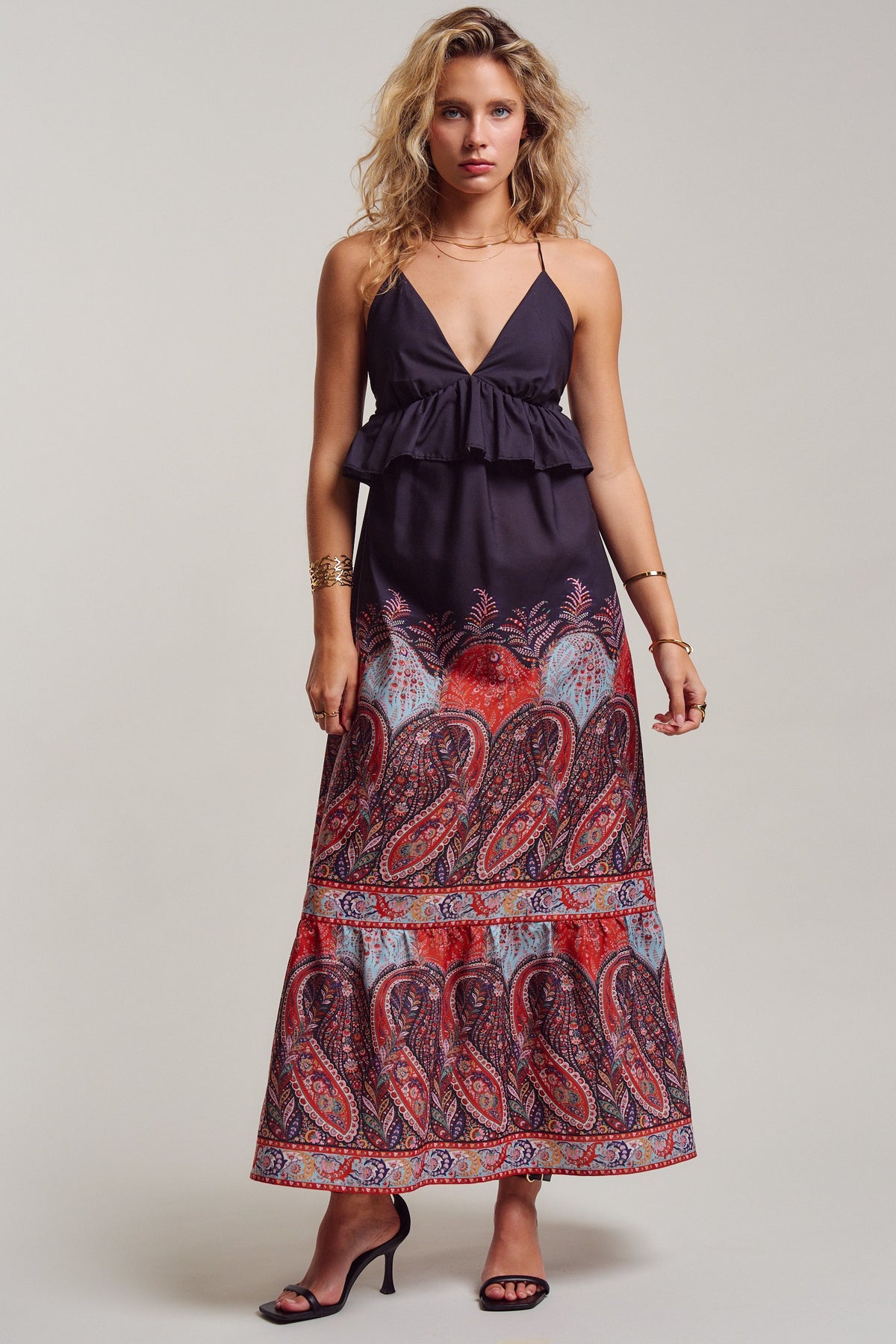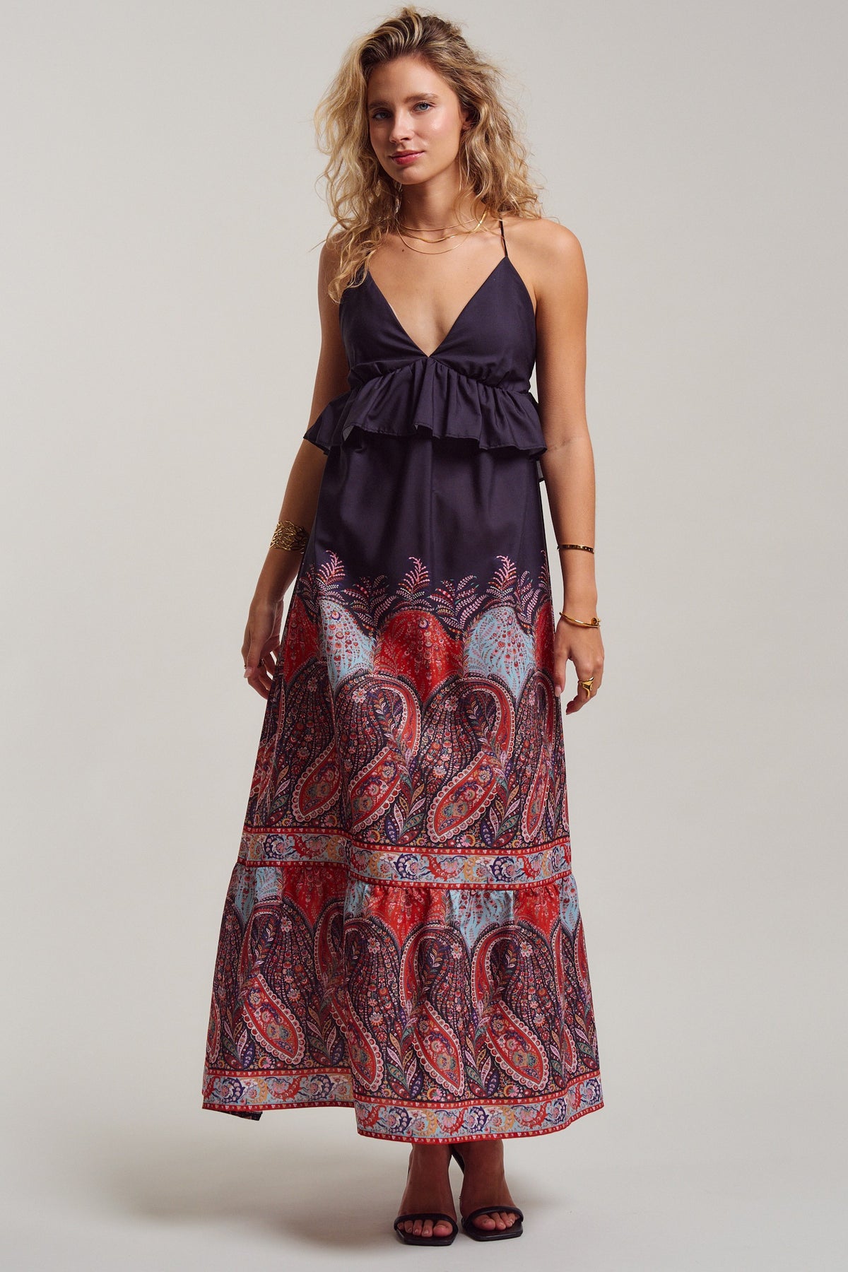 All eyes on you! with this ultimate boho sunset-ready dress. A deep V-neckline with a flirty ruffle peplum flows into a sweeping maxi skirt in rich crimson, dusty blue, and midnight navy paisley. Delicate cross-back straps with an adjustable tie add just the right amount of allure. Pair it with flat sandals for sun-soaked summer beach days, or heels and gold for warm evening nights.