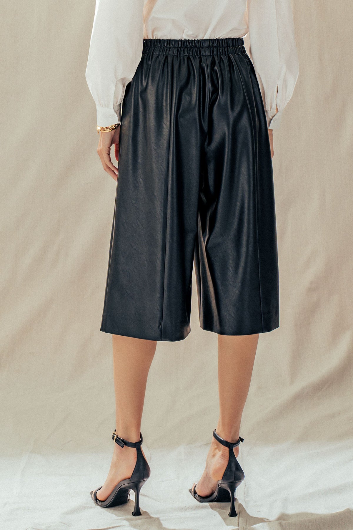 Catch eyes in these vegan leather pants. Featuring a comfortable pull-on elastic waist and a softly structured wide leg, they drape beautifully with every step. Style them with a tank and western boots for a bold look, elevate with strappy heels for a chic night out, or keep it casual with simple sandals-endlessly versatile, always polished.
