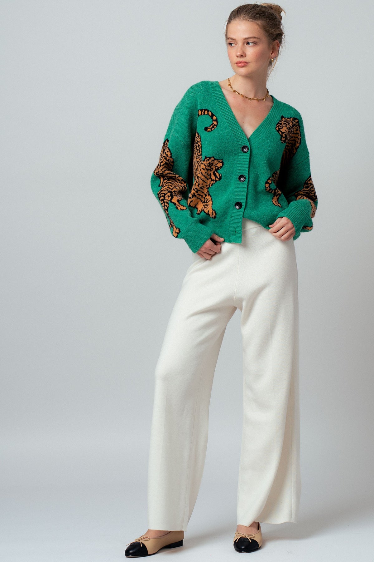 Fierce meets fashion in this statement knit cardigan. Featuring an allover tiger intarsia design and a relaxed, easy fit, this button-front piece adds instant personality to any look. A cool, endlessly wearable layer, it pairs perfectly with your favorite denim, tailored trousers, or thrown over dresses for bold everyday style.