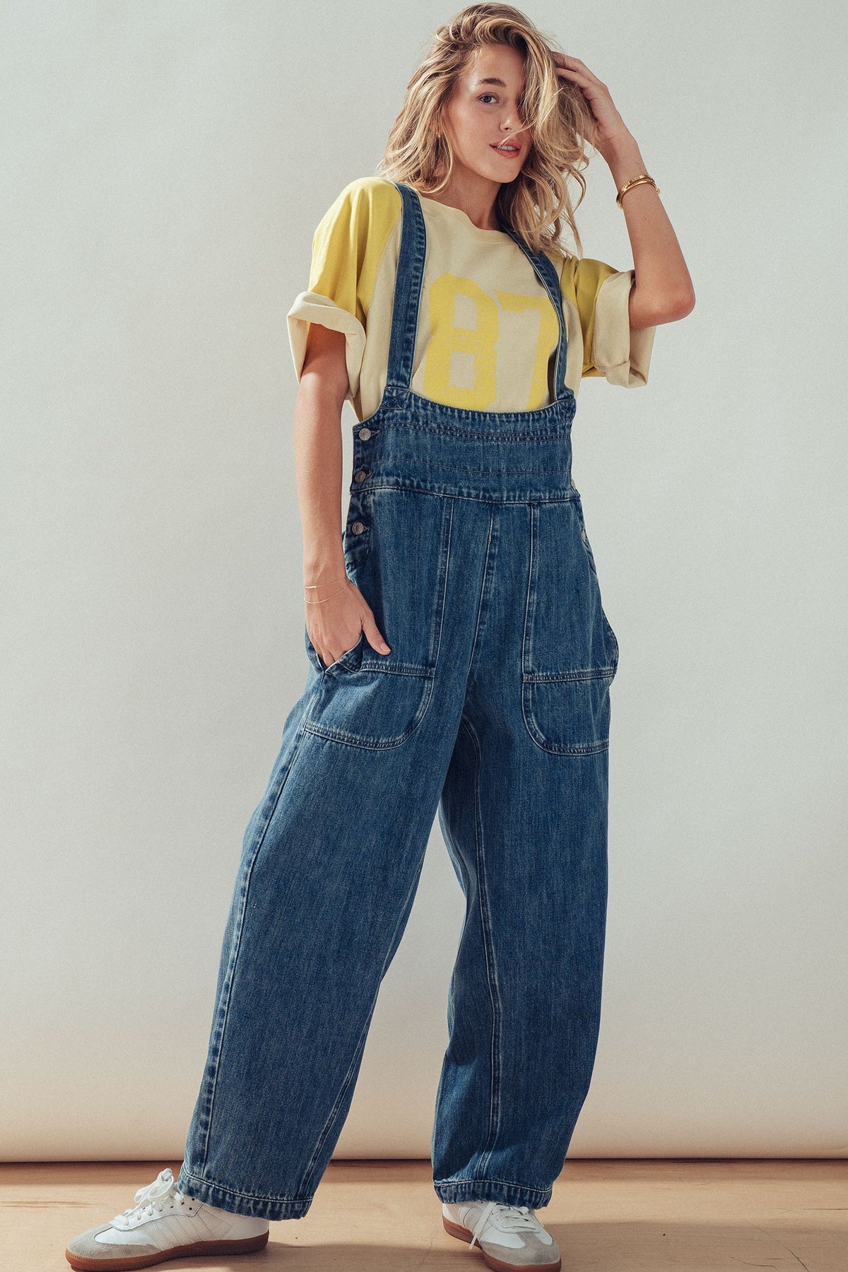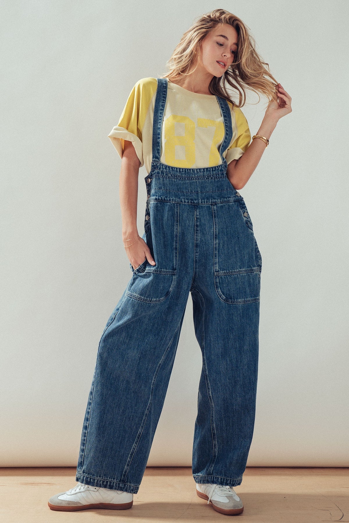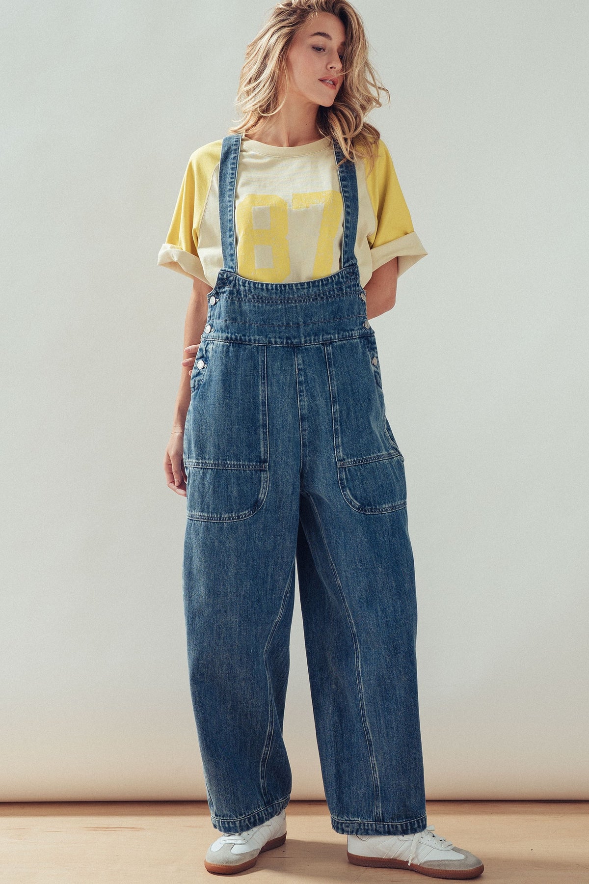 A laid-back classic with a vintage-inspired feel. These denim overalls feature a relaxed silhouette with wide legs and adjustable shoulder straps, finished with utility-style pockets and metal button details. Easy, effortless, and endlessly wearable for everyday styling.