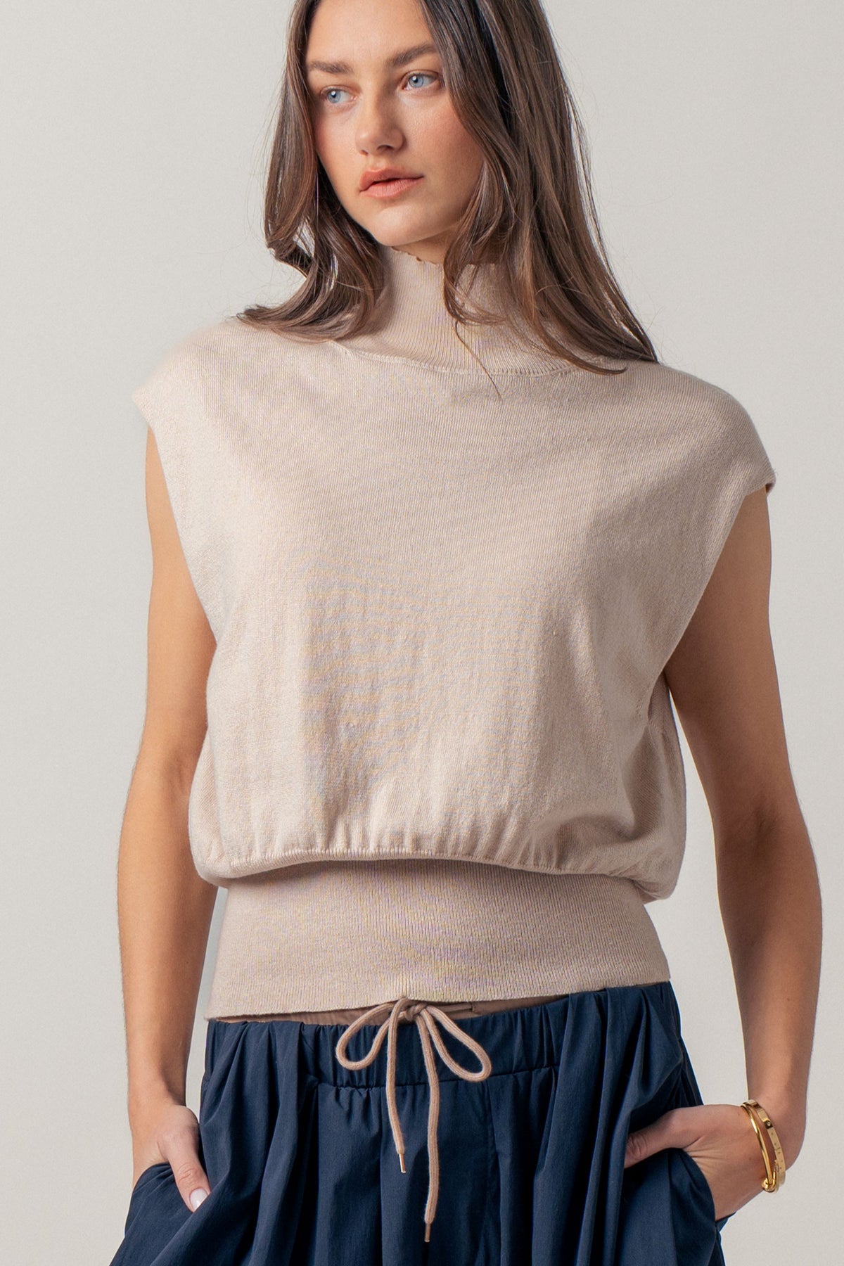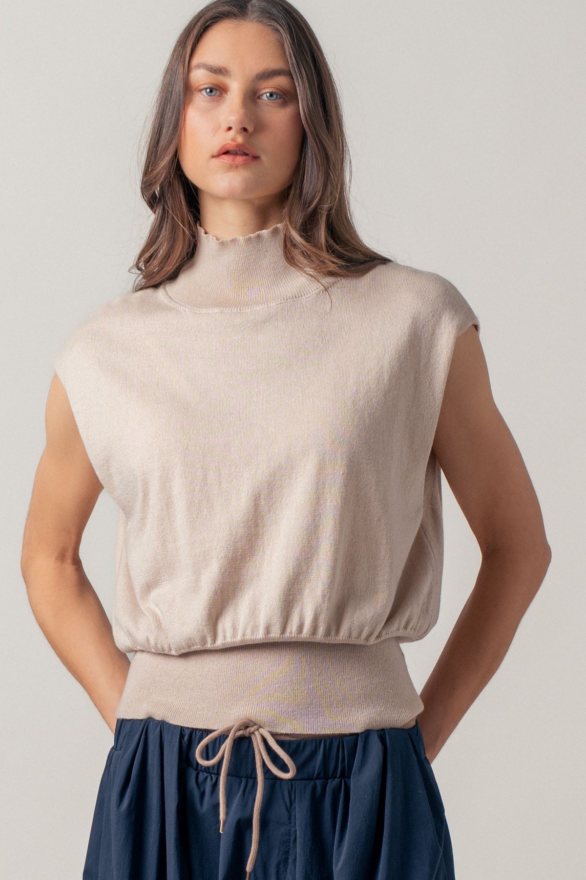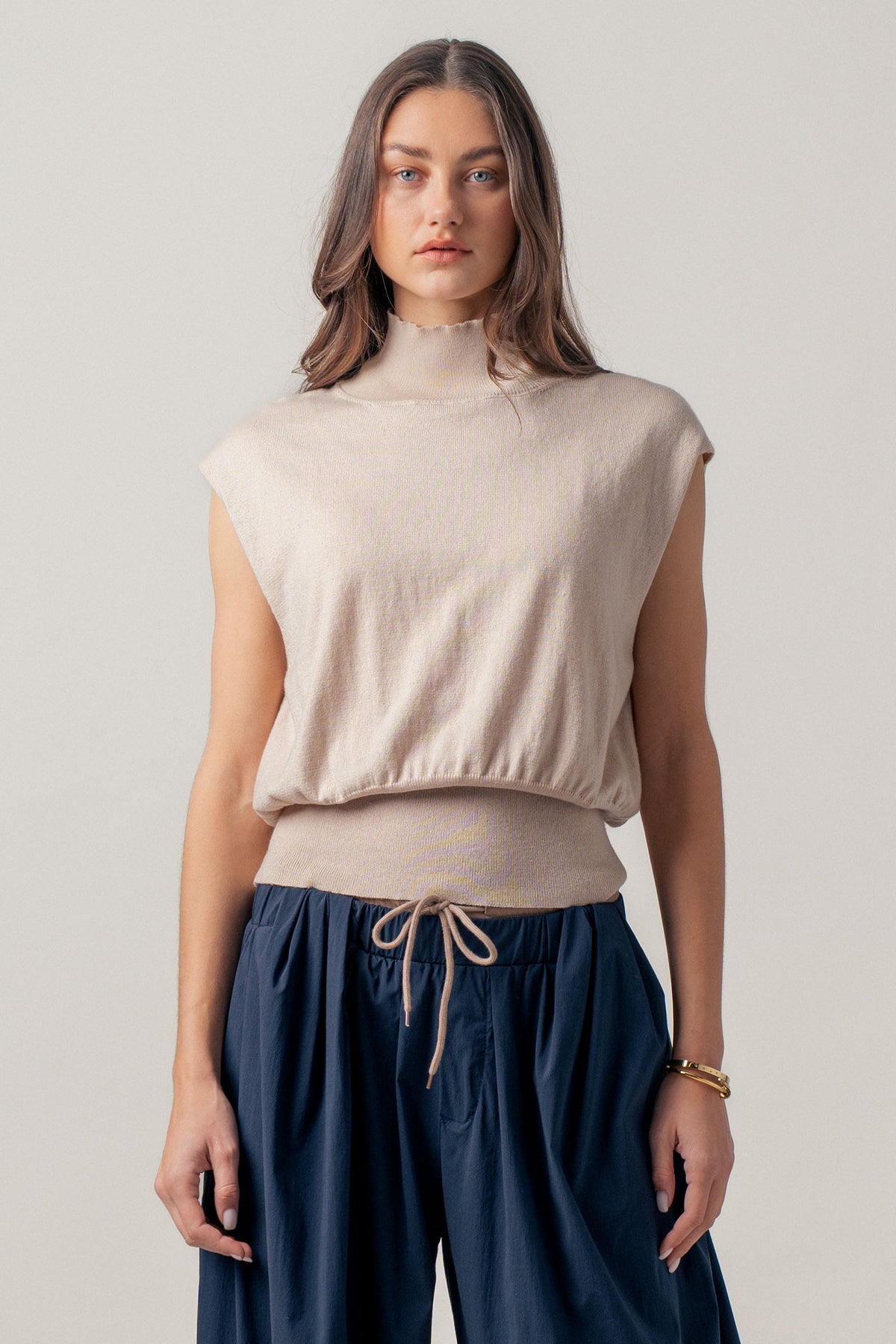 A true wardrobe classic with understated elegance, this mockneck top features a polished neckline, subtle shoulder structure, and a flattering blouson fit. Wear it tucked into tailored pants or styled with a skirt and loafers for that effortlessly put-together, old-money vibe.