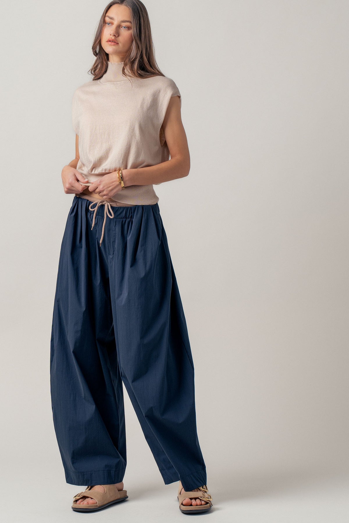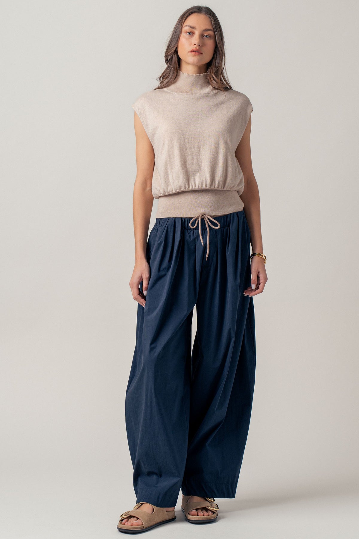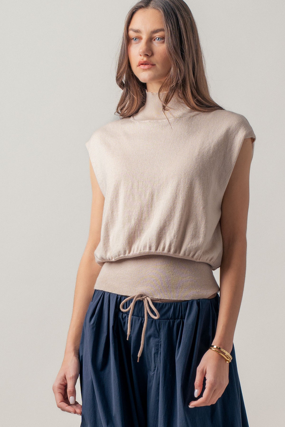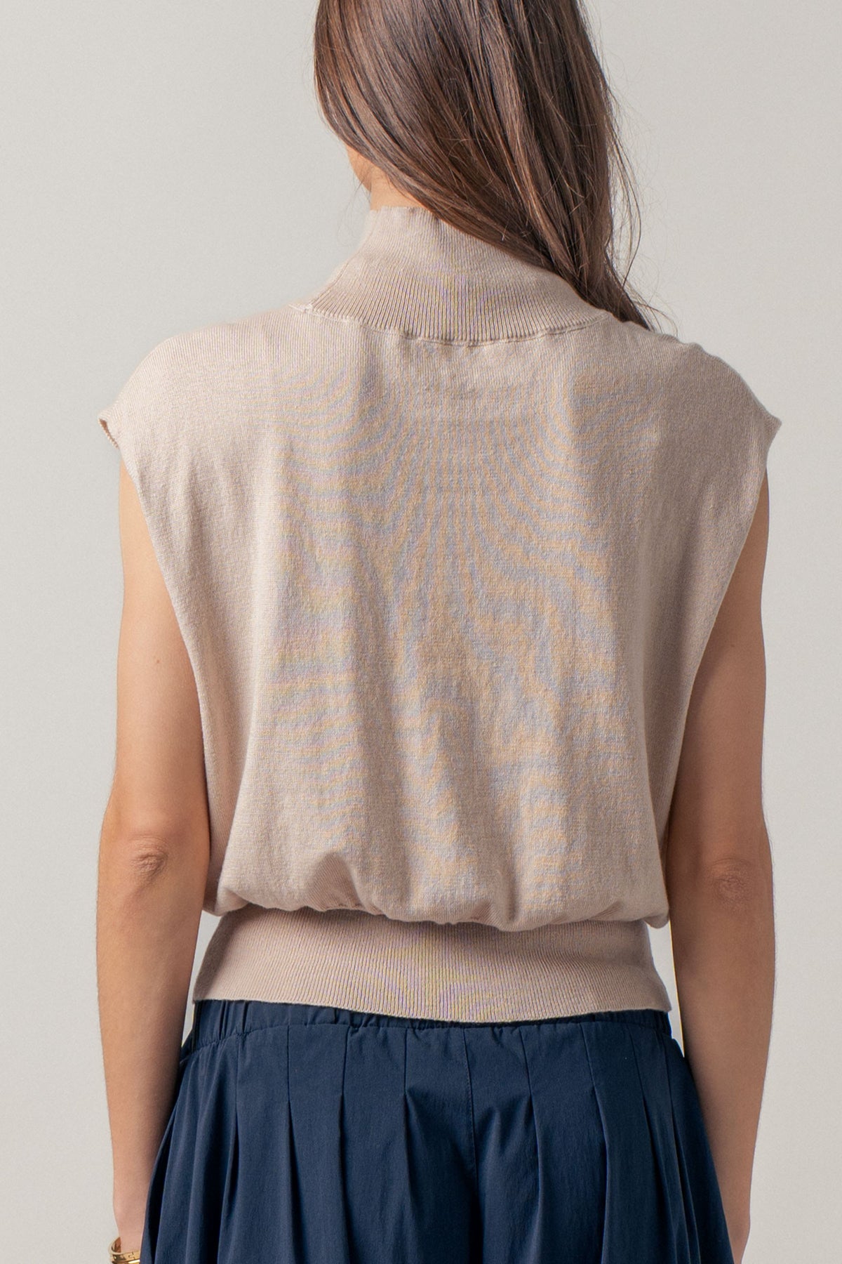 A true wardrobe classic with understated elegance, this mockneck top features a polished neckline, subtle shoulder structure, and a flattering blouson fit. Wear it tucked into tailored pants or styled with a skirt and loafers for that effortlessly put-together, old-money vibe.