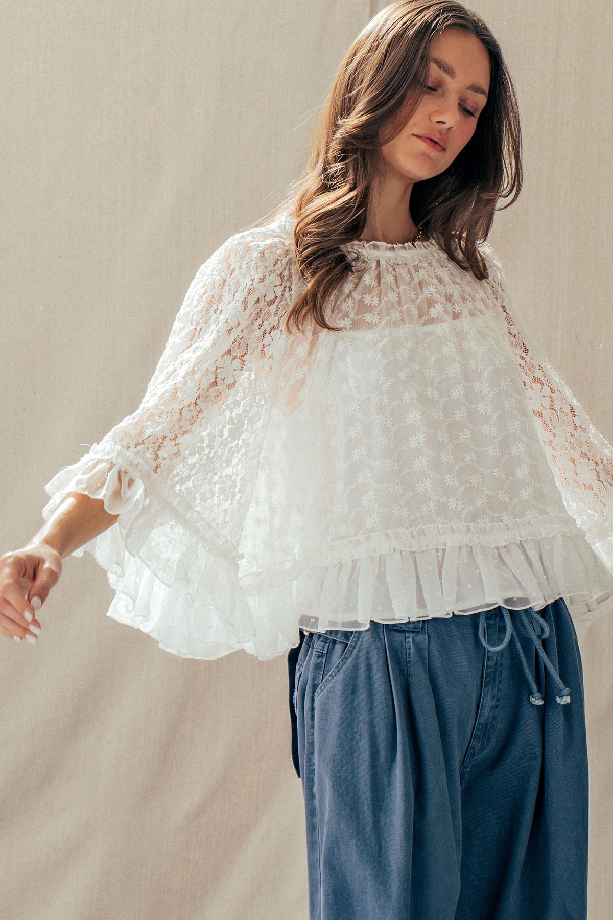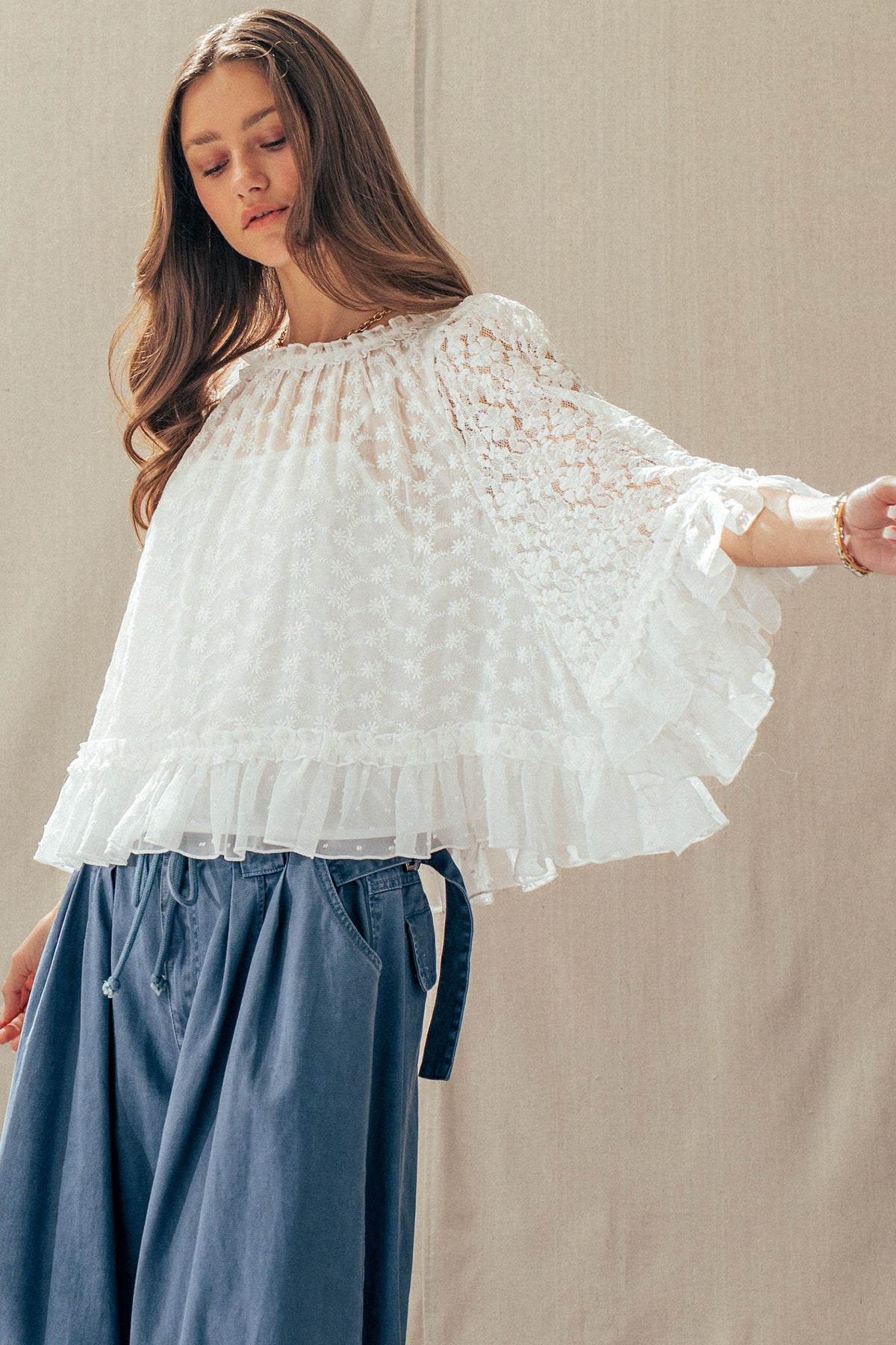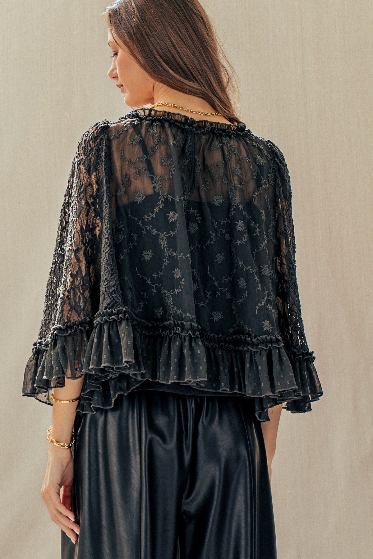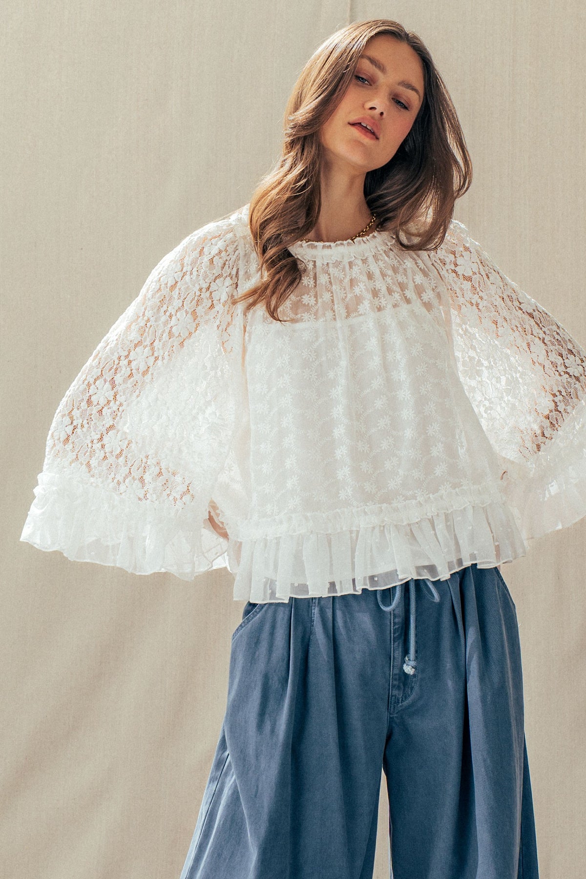 A dreamy lace cape top designed to elevate any look. Featuring delicate floral detailing, sheer statement sleeves, and a soft ruffle hem, it delivers effortless romance. Style it with denim or wide-leg pants for a polished, boho-chic Valentine's Day moment.