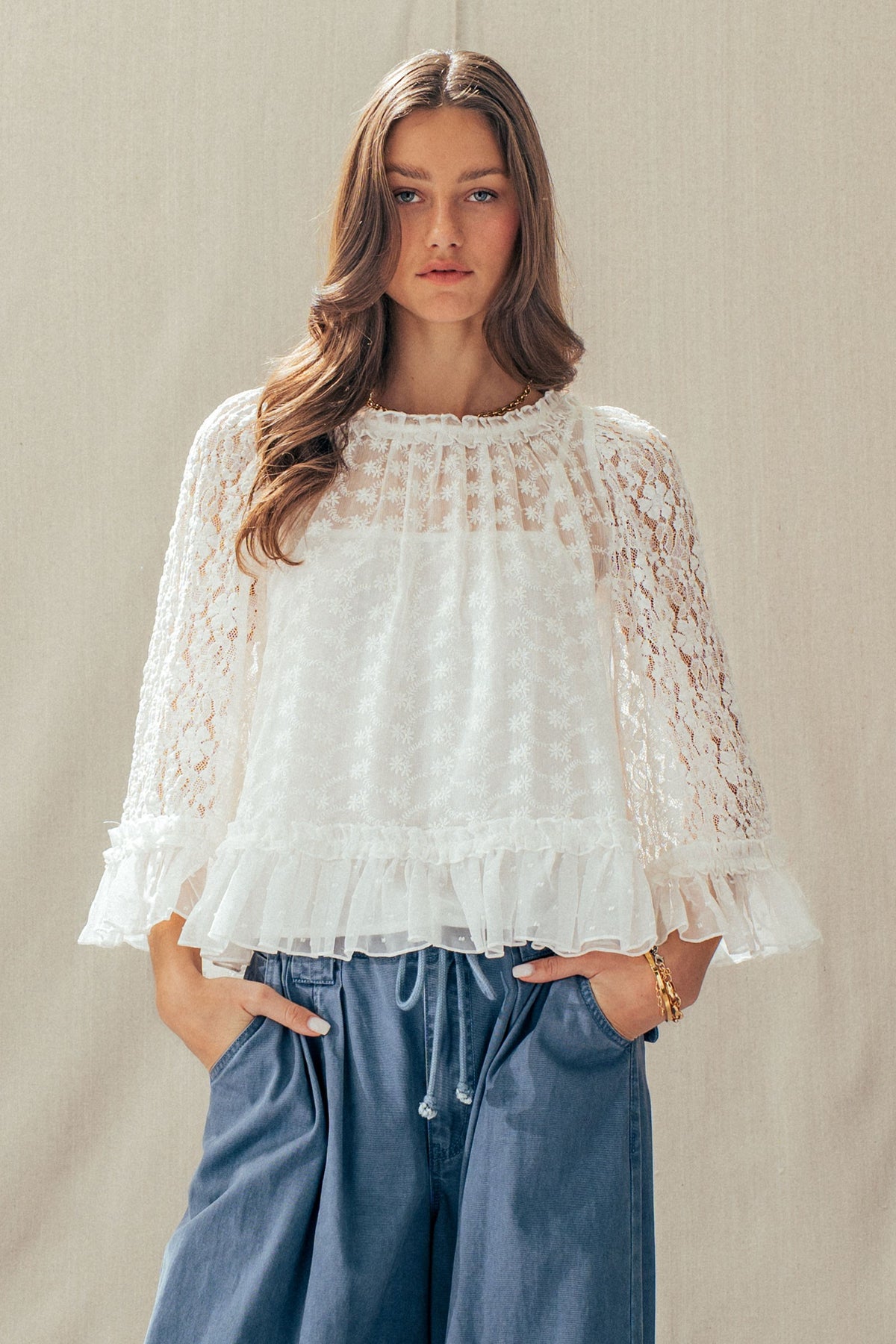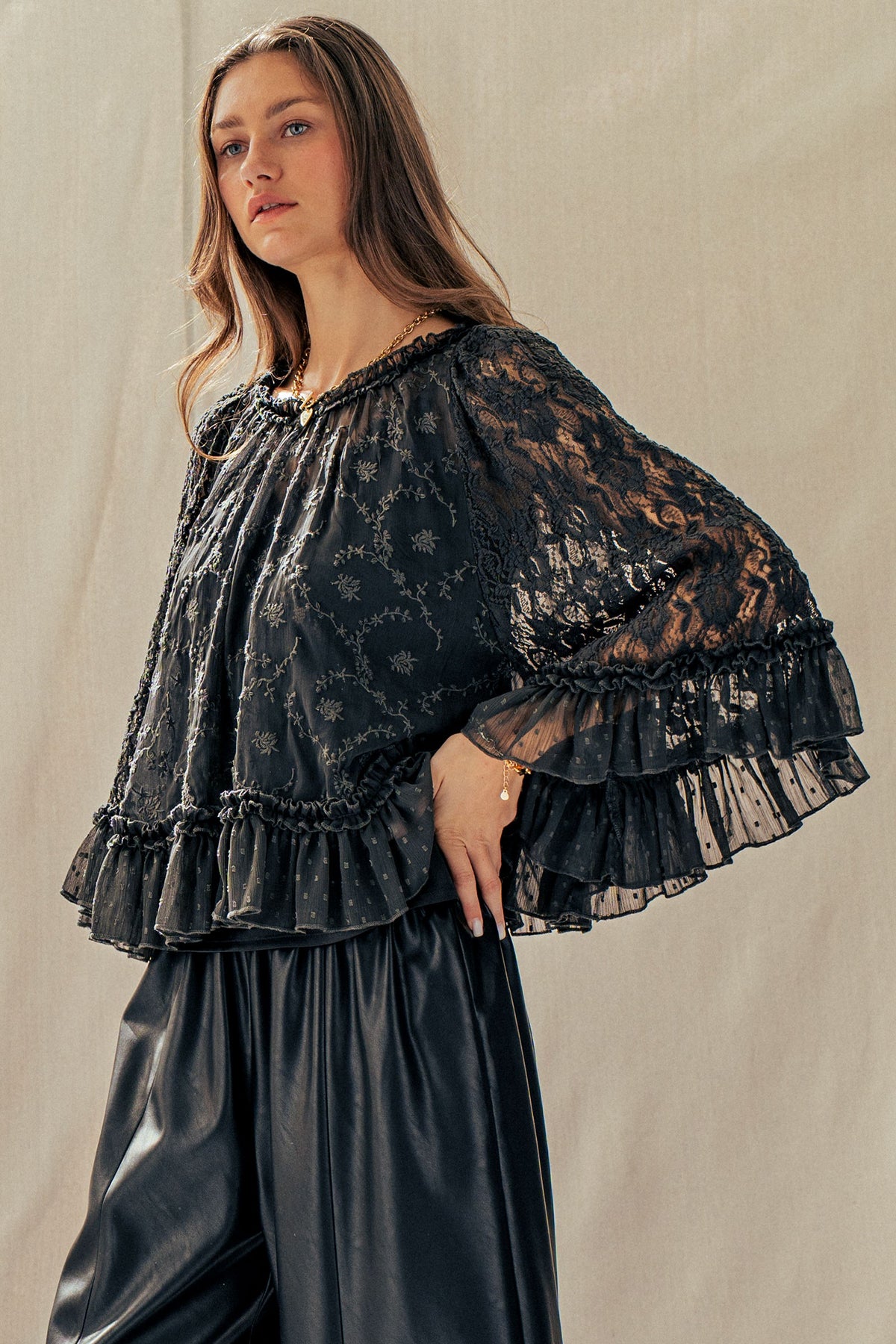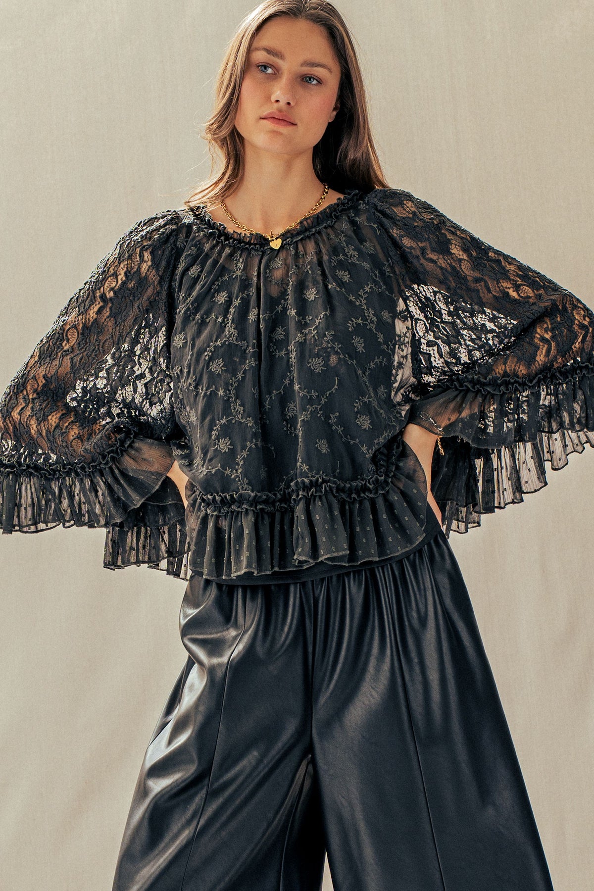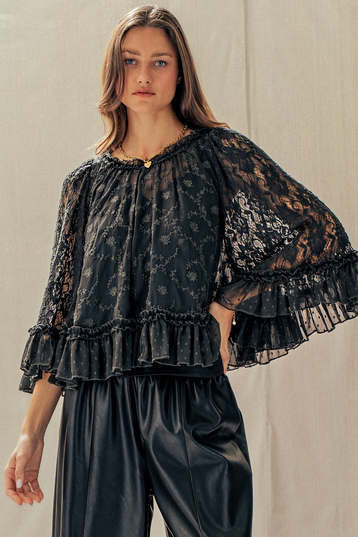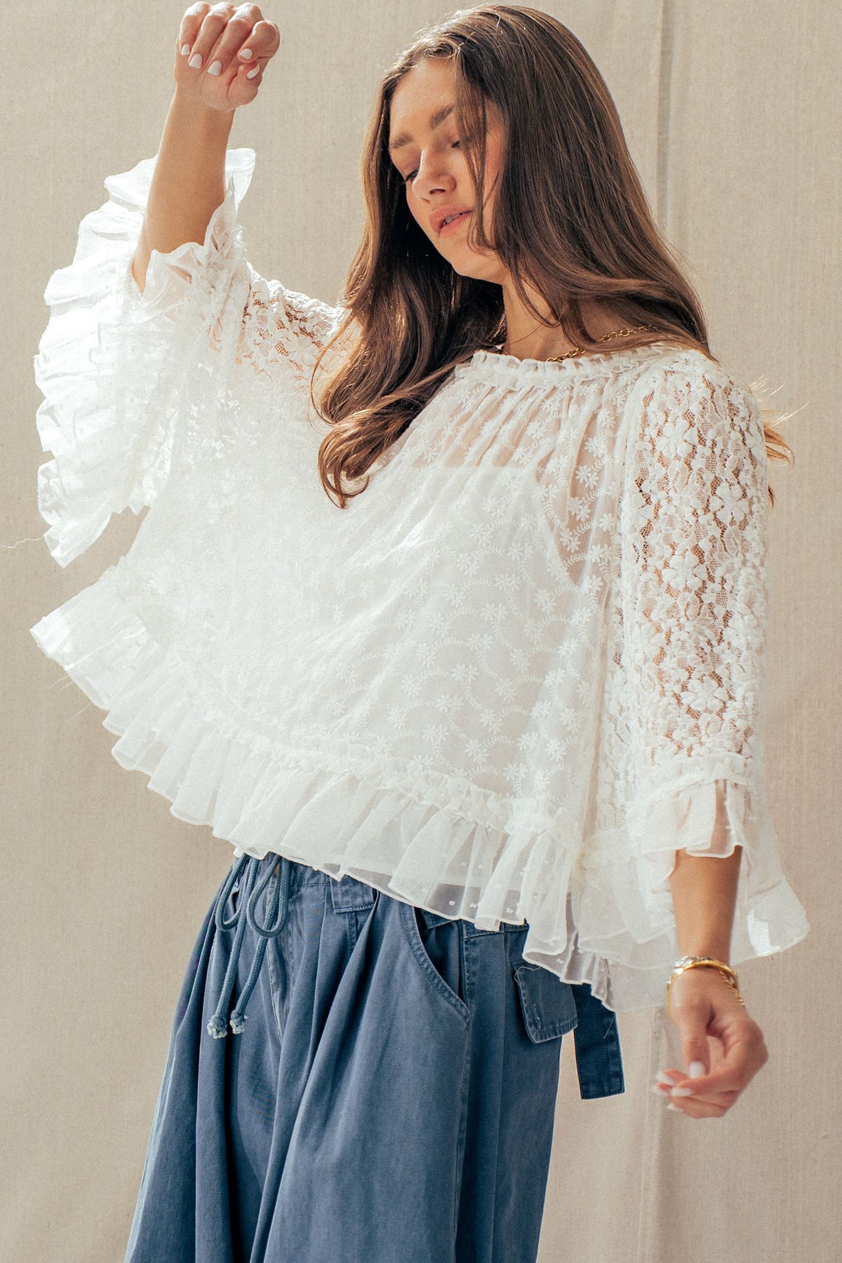 A dreamy lace cape top designed to elevate any look. Featuring delicate floral detailing, sheer statement sleeves, and a soft ruffle hem, it delivers effortless romance. Style it with denim or wide-leg pants for a polished, boho-chic Valentine's Day moment.