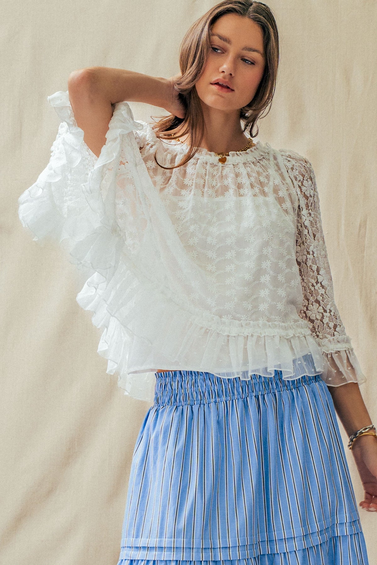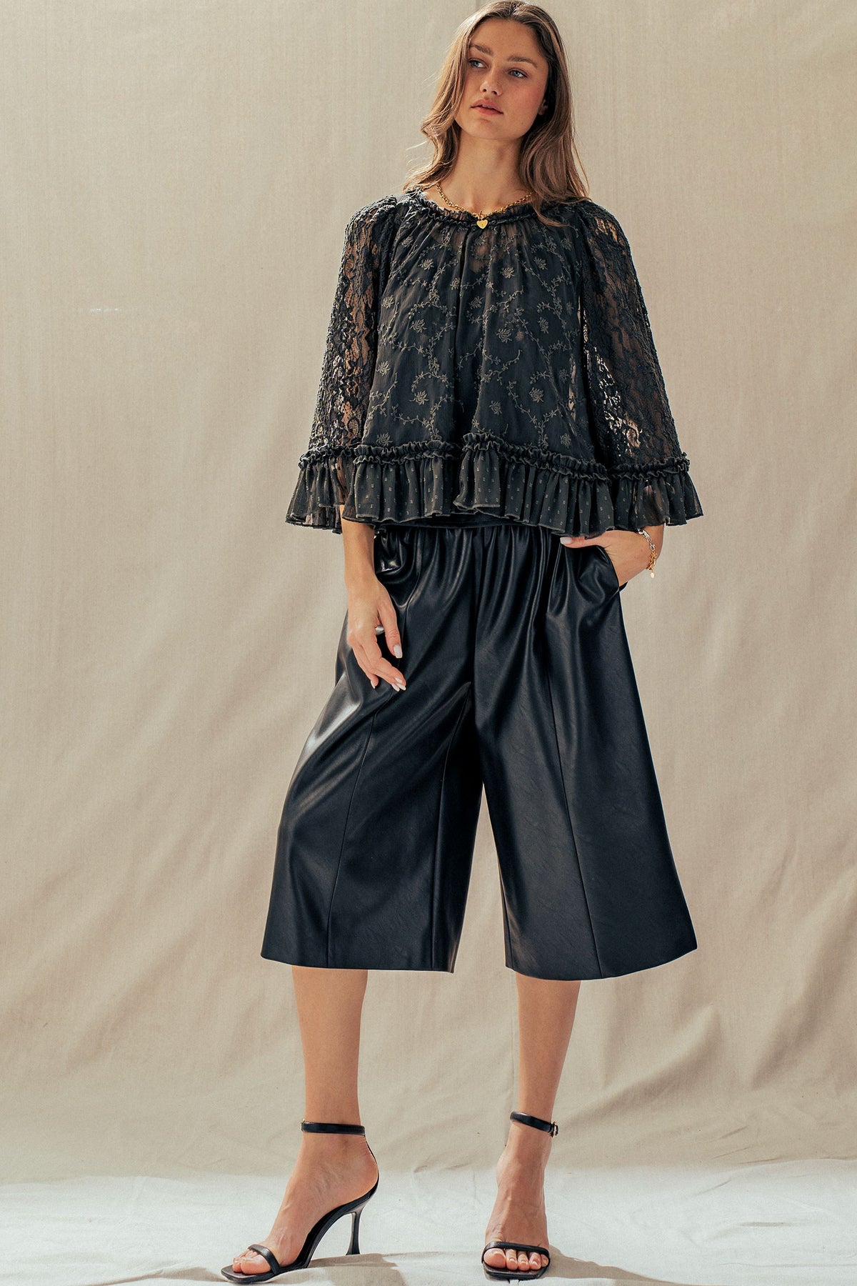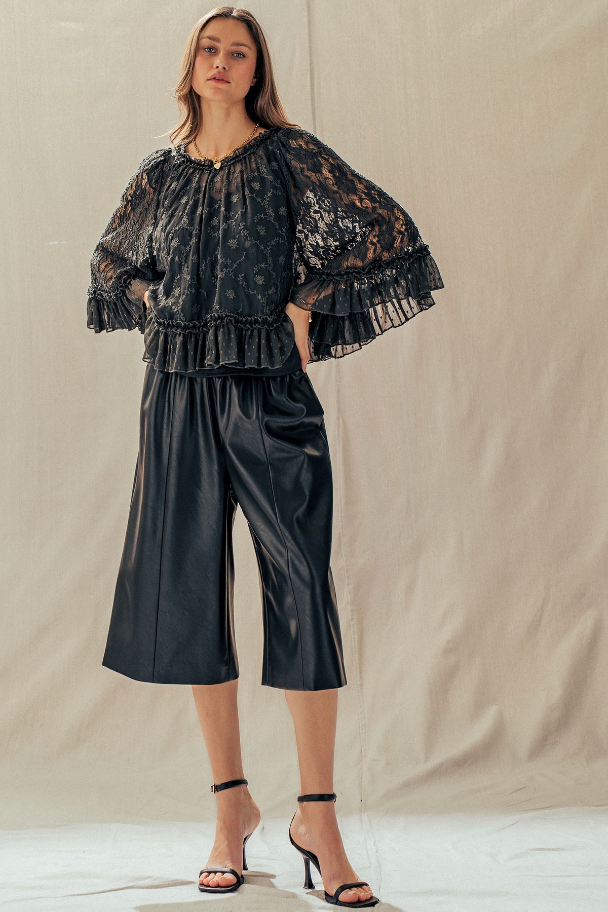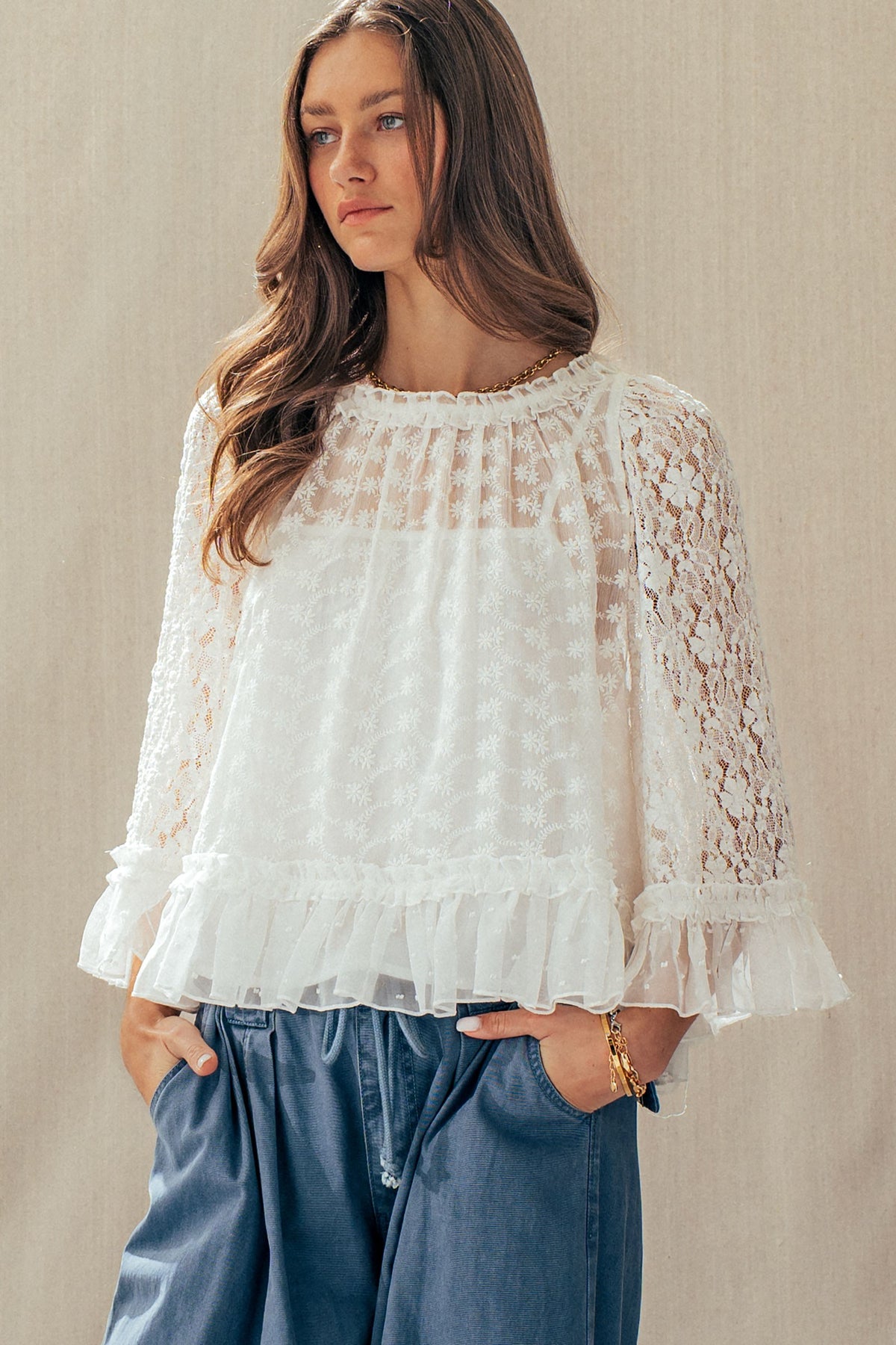 A dreamy lace cape top designed to elevate any look. Featuring delicate floral detailing, sheer statement sleeves, and a soft ruffle hem, it delivers effortless romance. Style it with denim or wide-leg pants for a polished, boho-chic Valentine's Day moment.