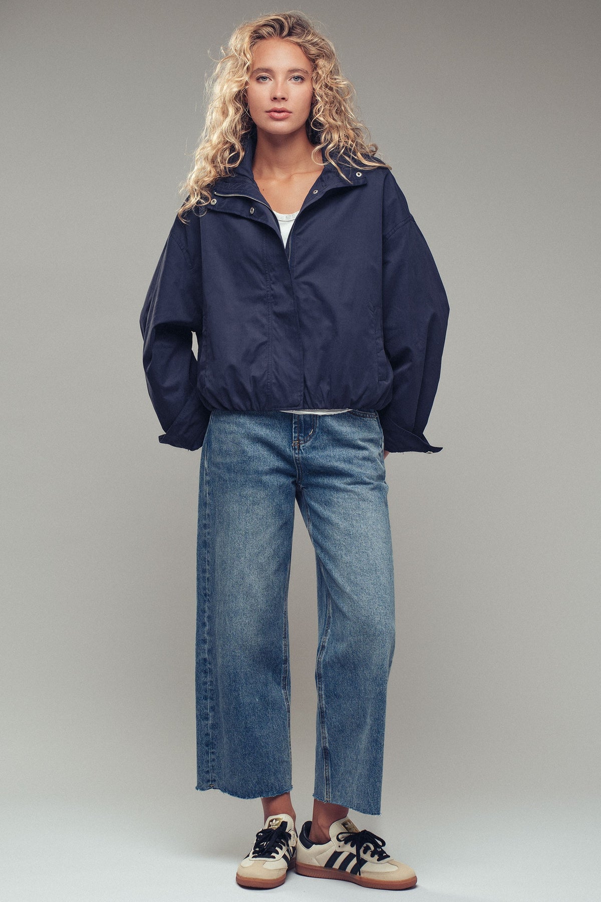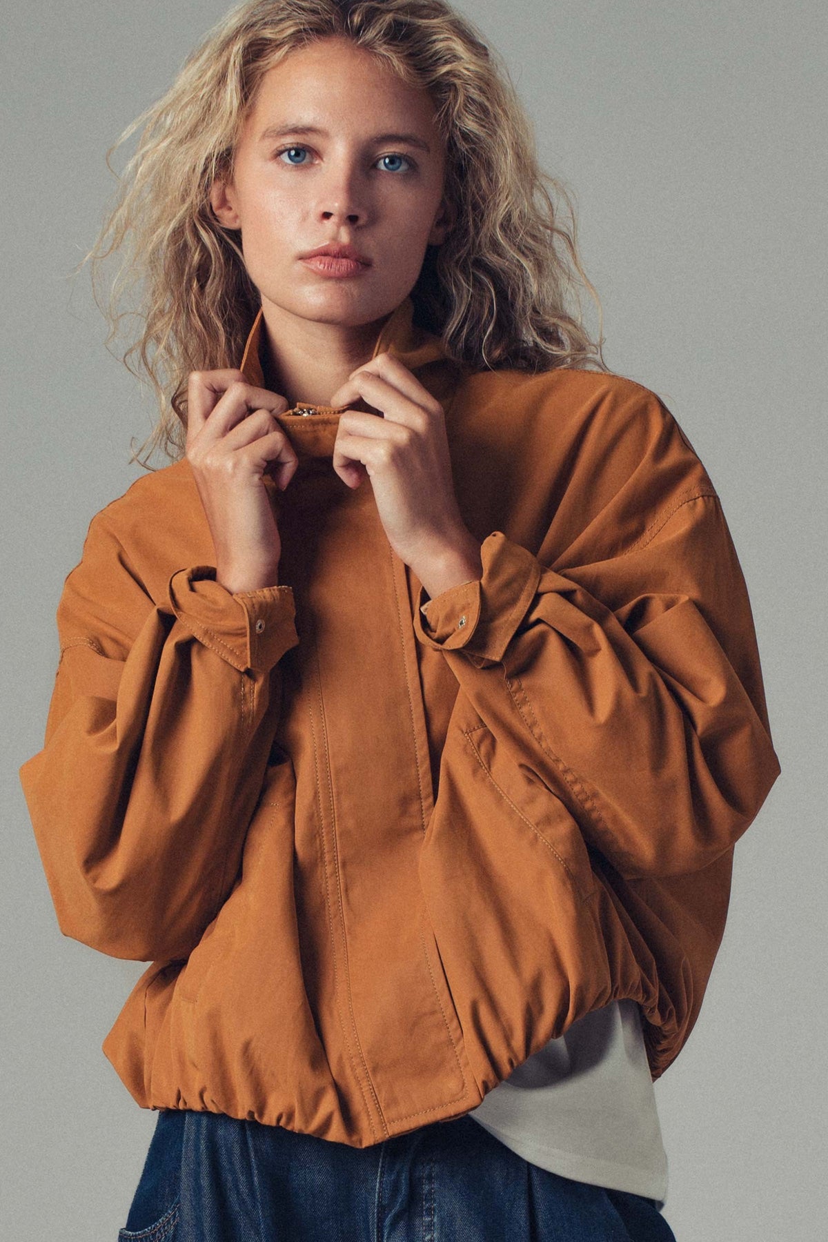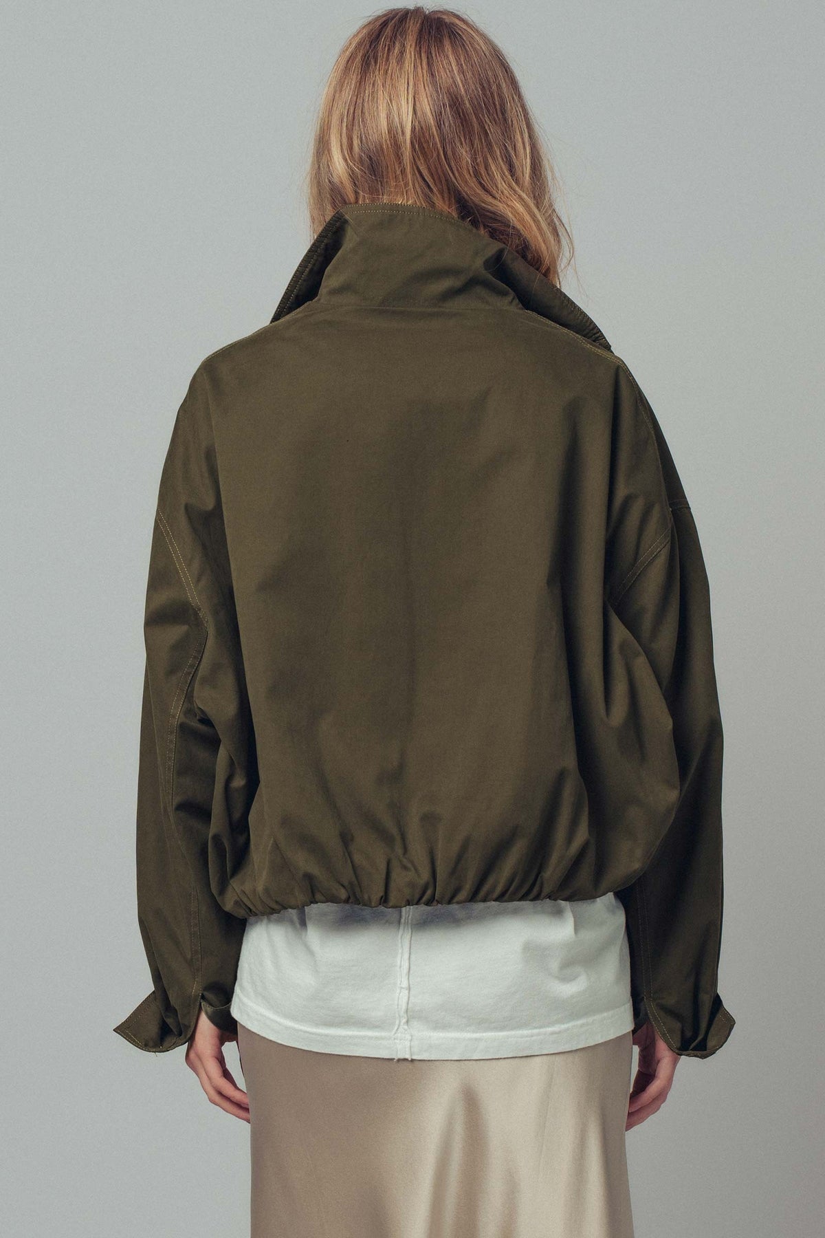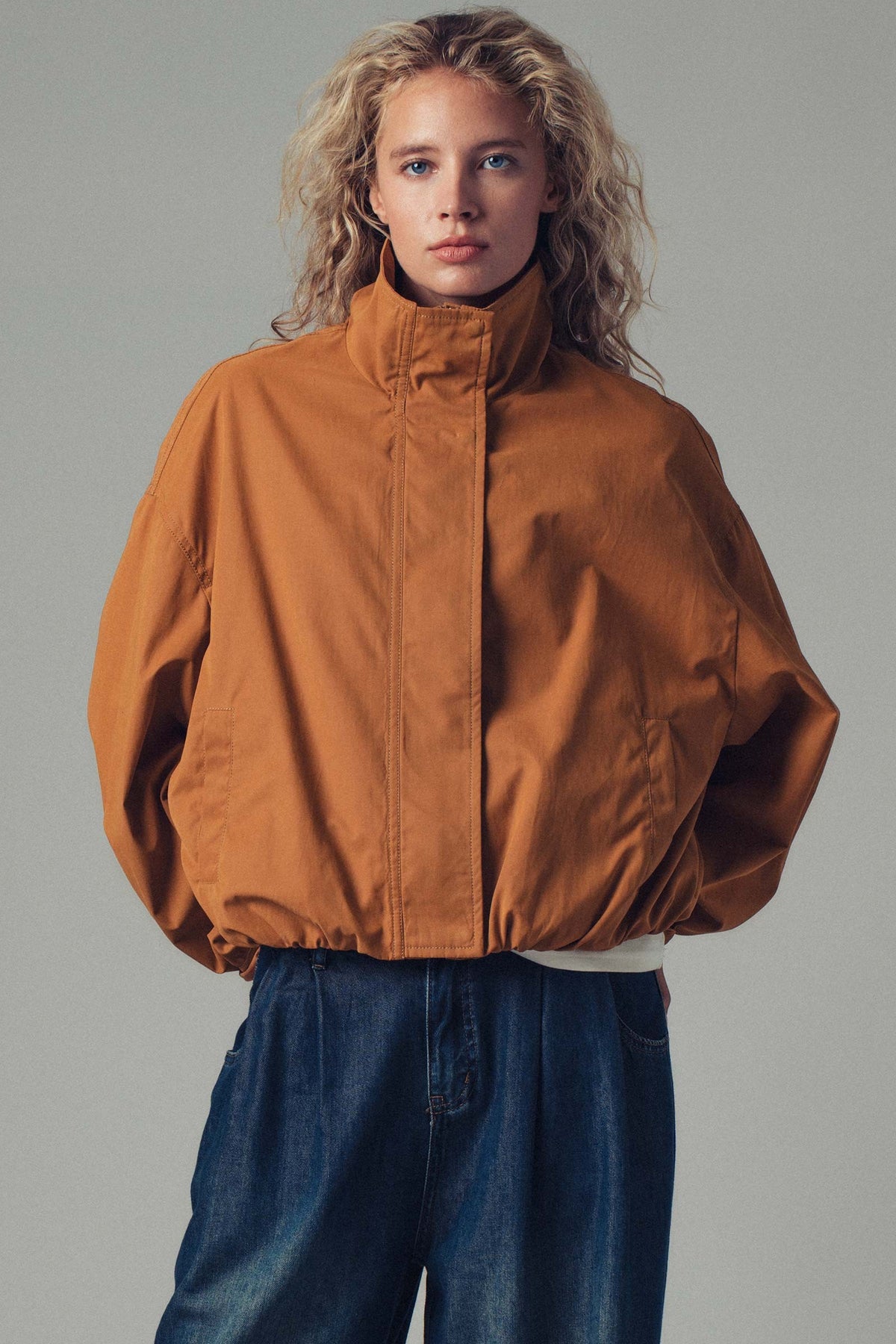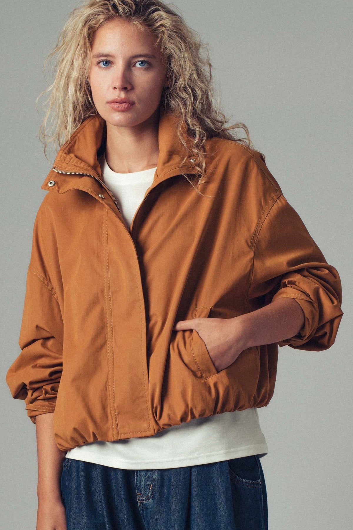 Crafted from durable cotton-blend fabric in a warm camel tone, it features a high stand collar, full zip closure with snap placket, and elasticized hem and cuffs for a tailored yet relaxed fit.