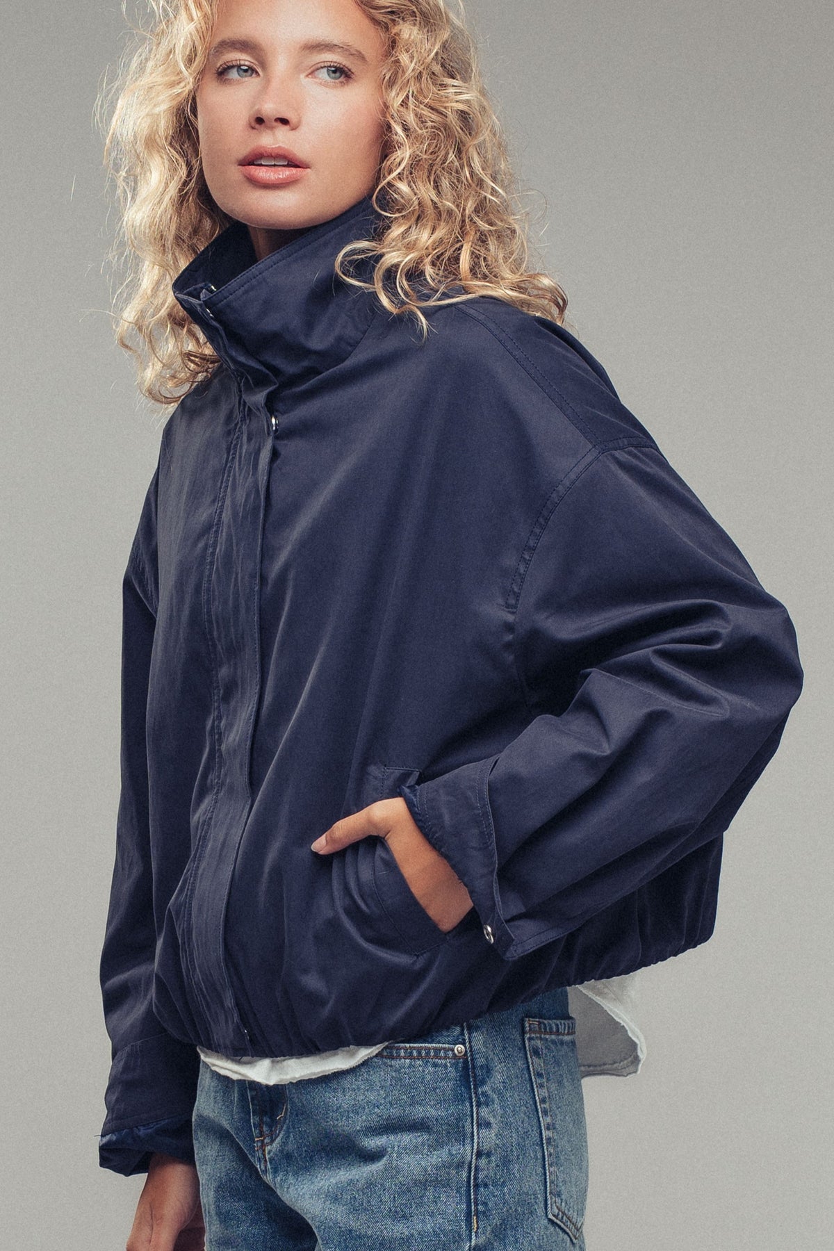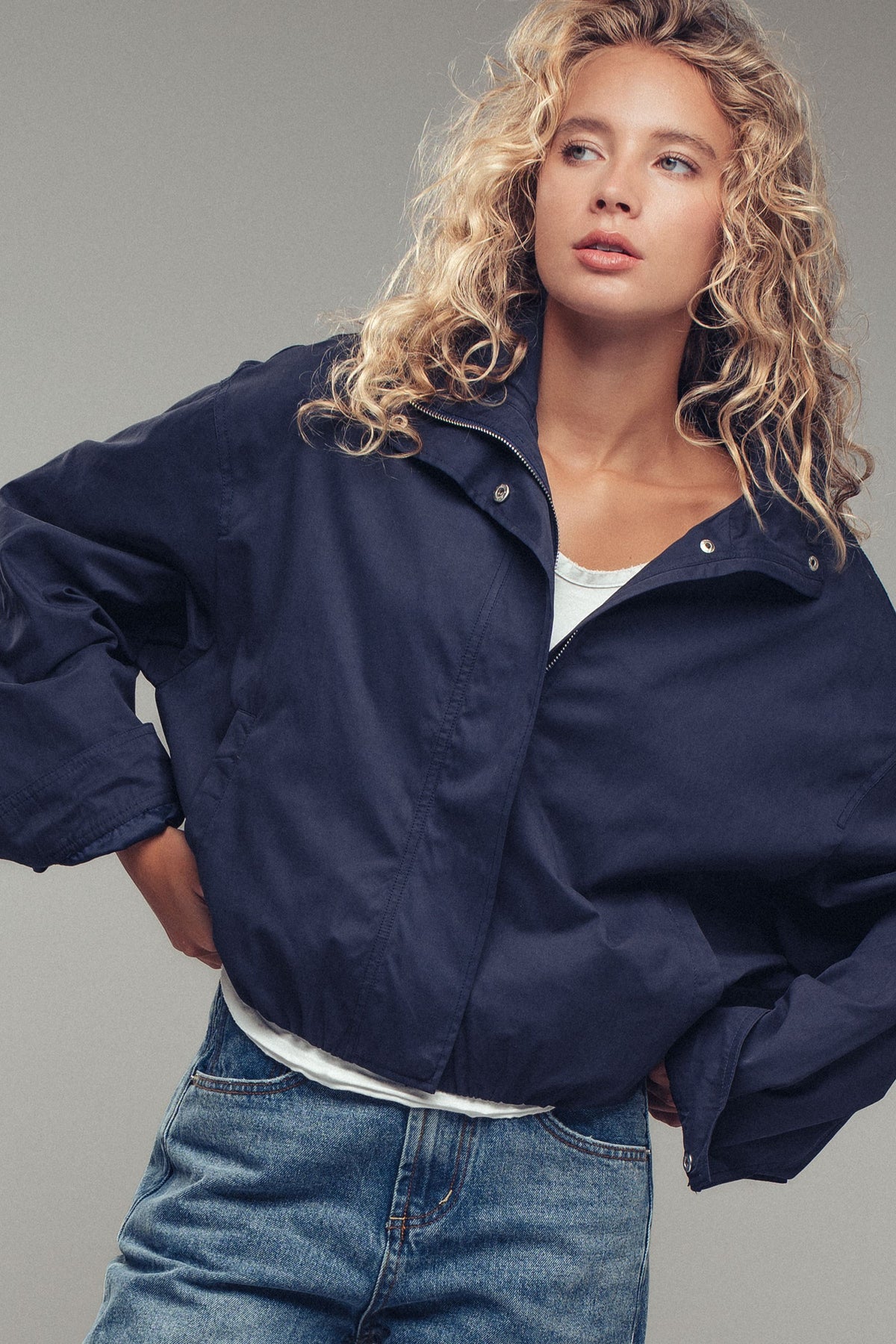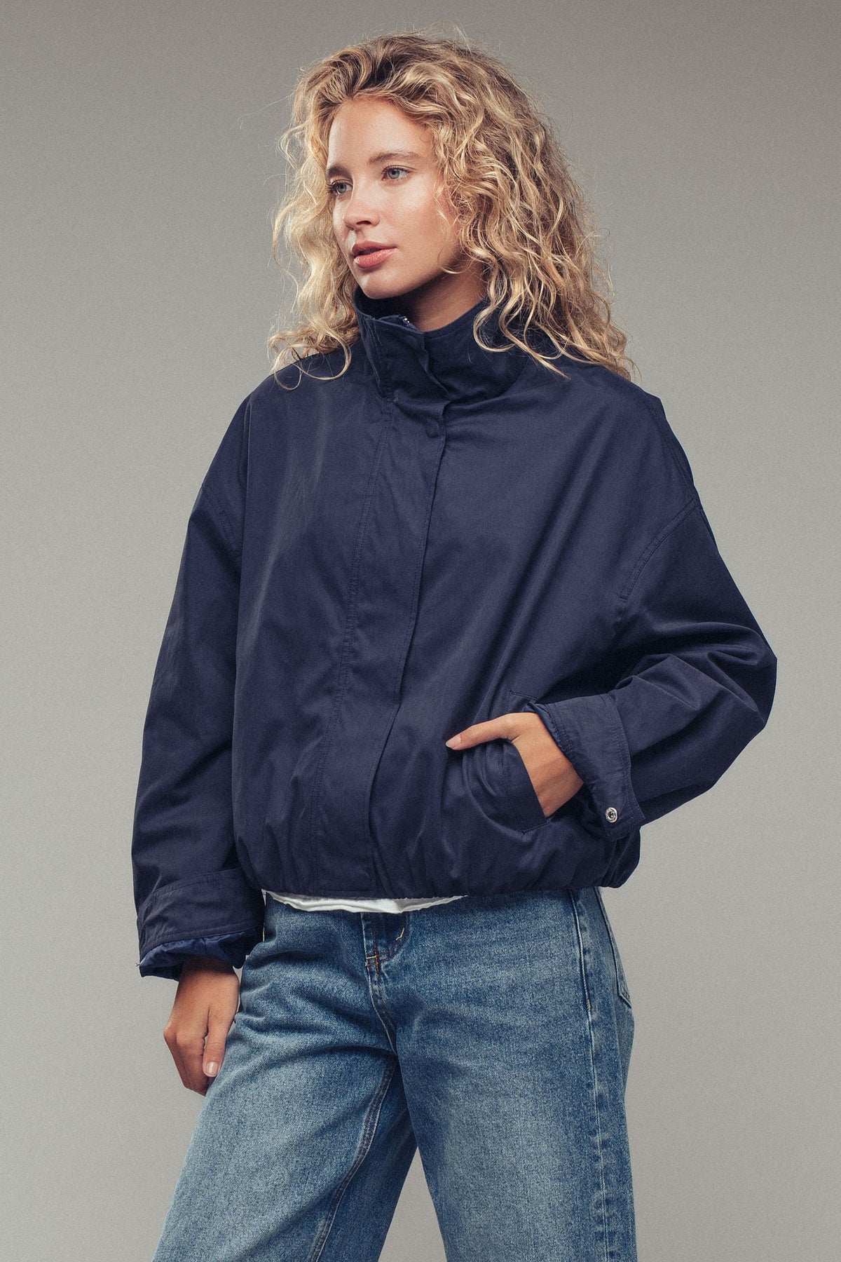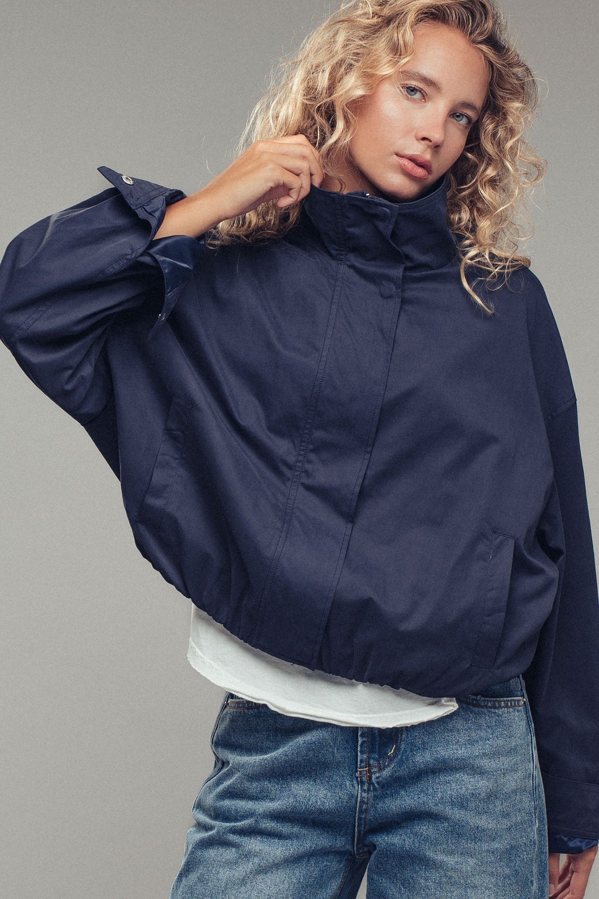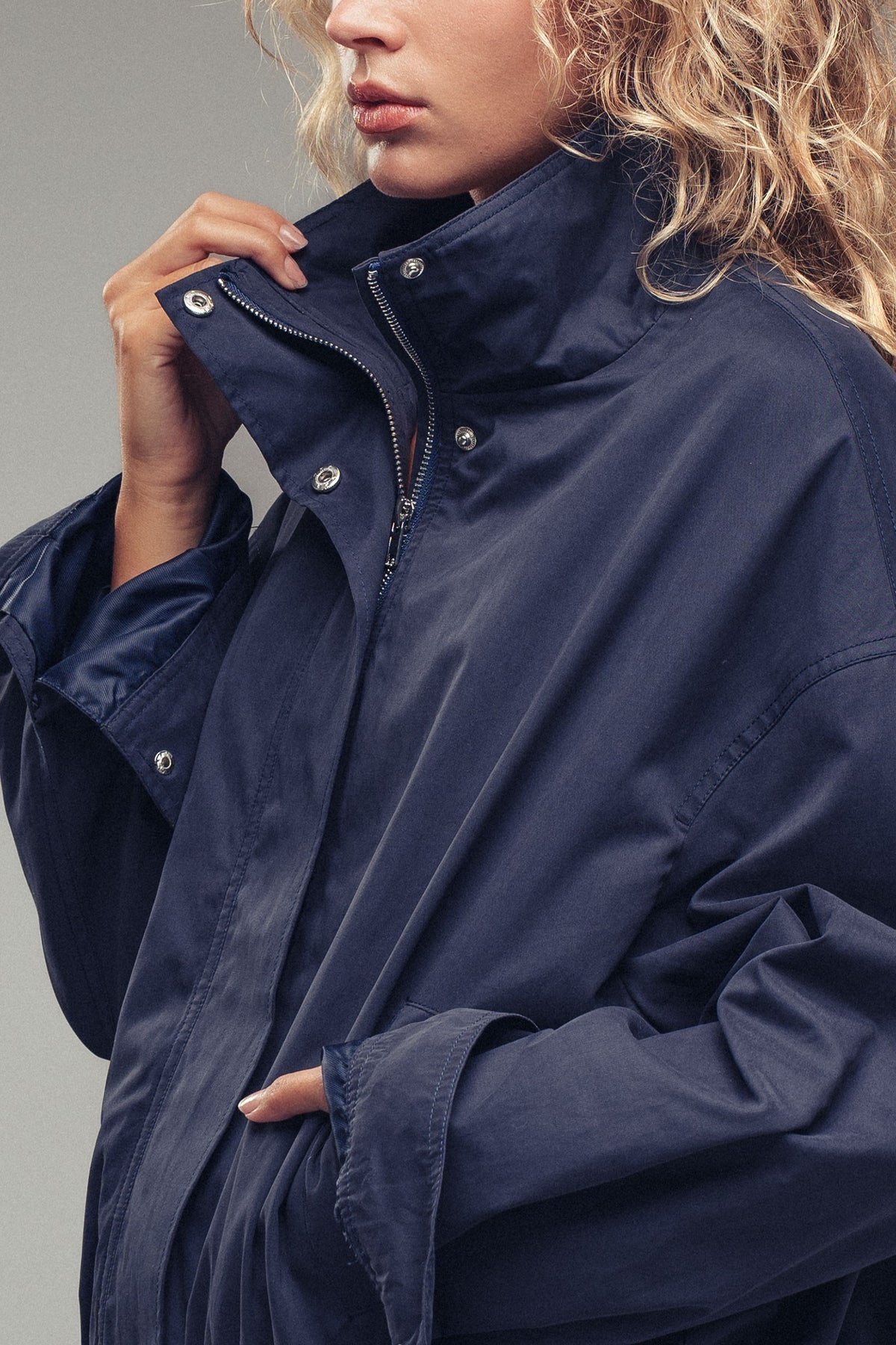 High stand collar with snap button closure