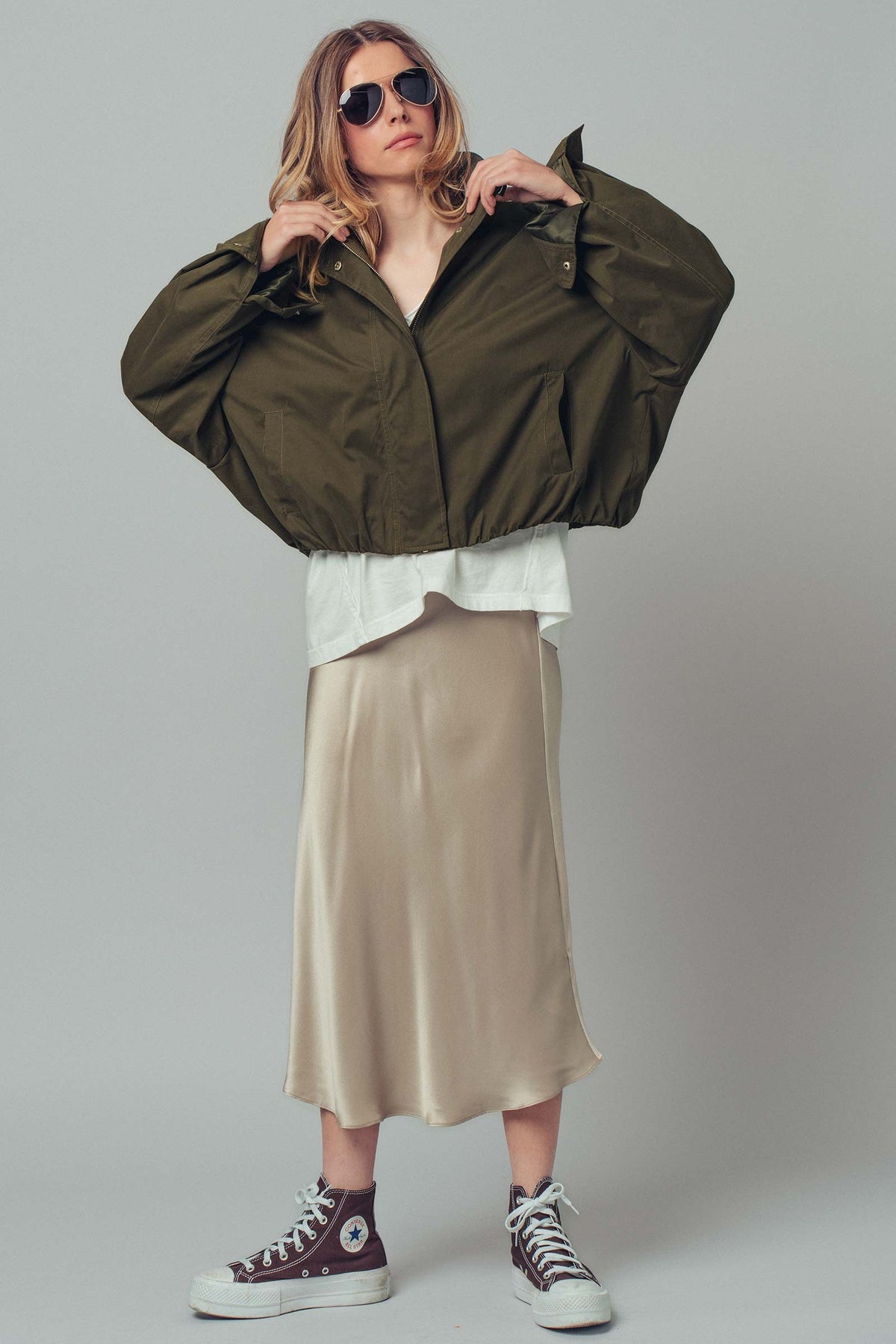 Full front zipper concealed by snap placket