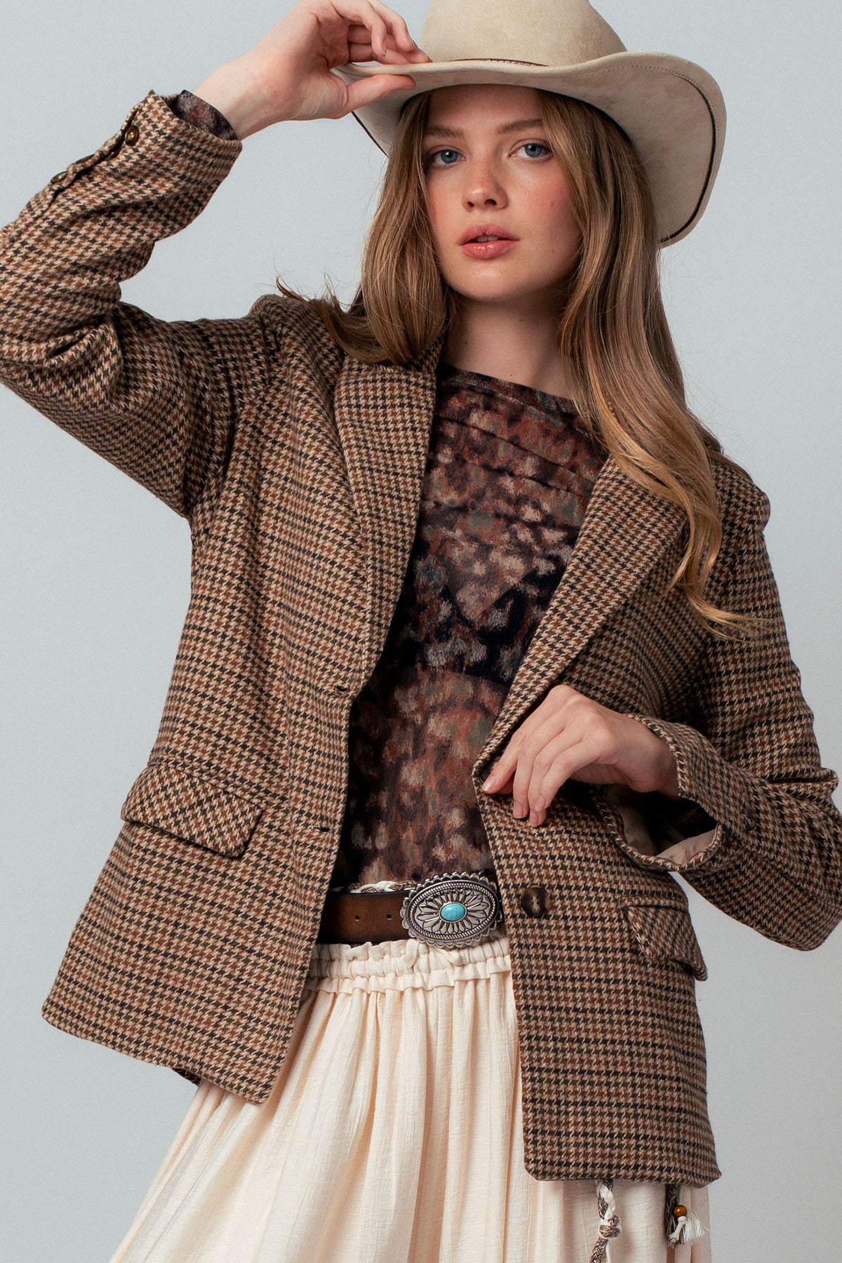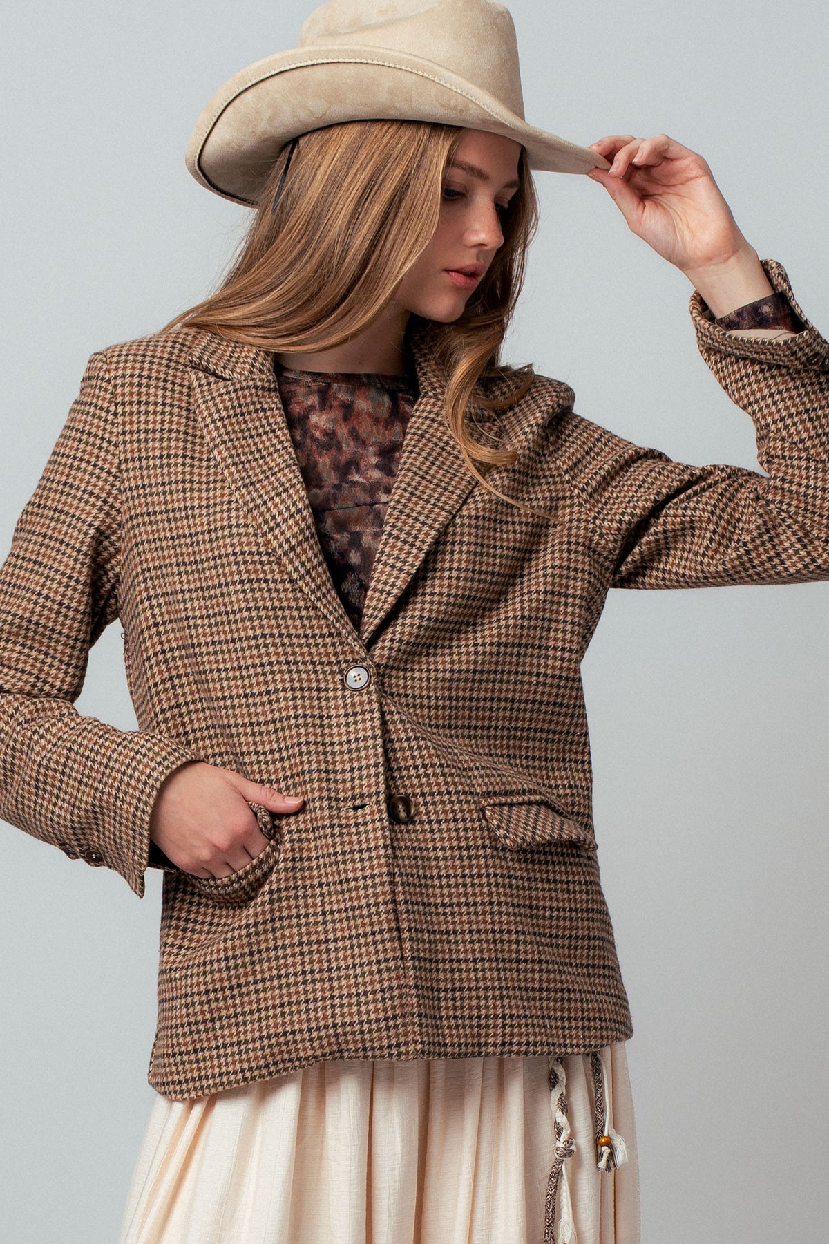 Classic tailoring meets timeless print in this houndstooth blazer, perfect for elevating everyday looks.