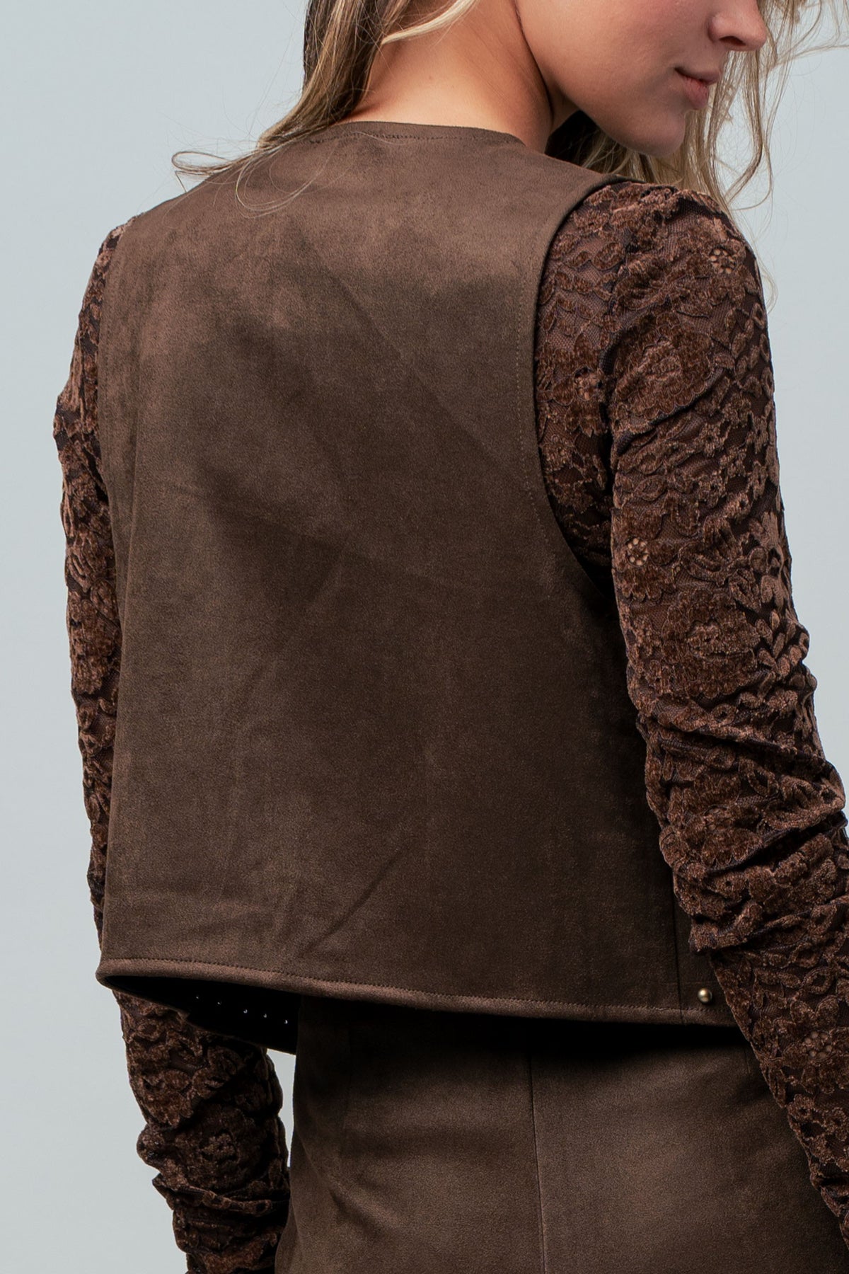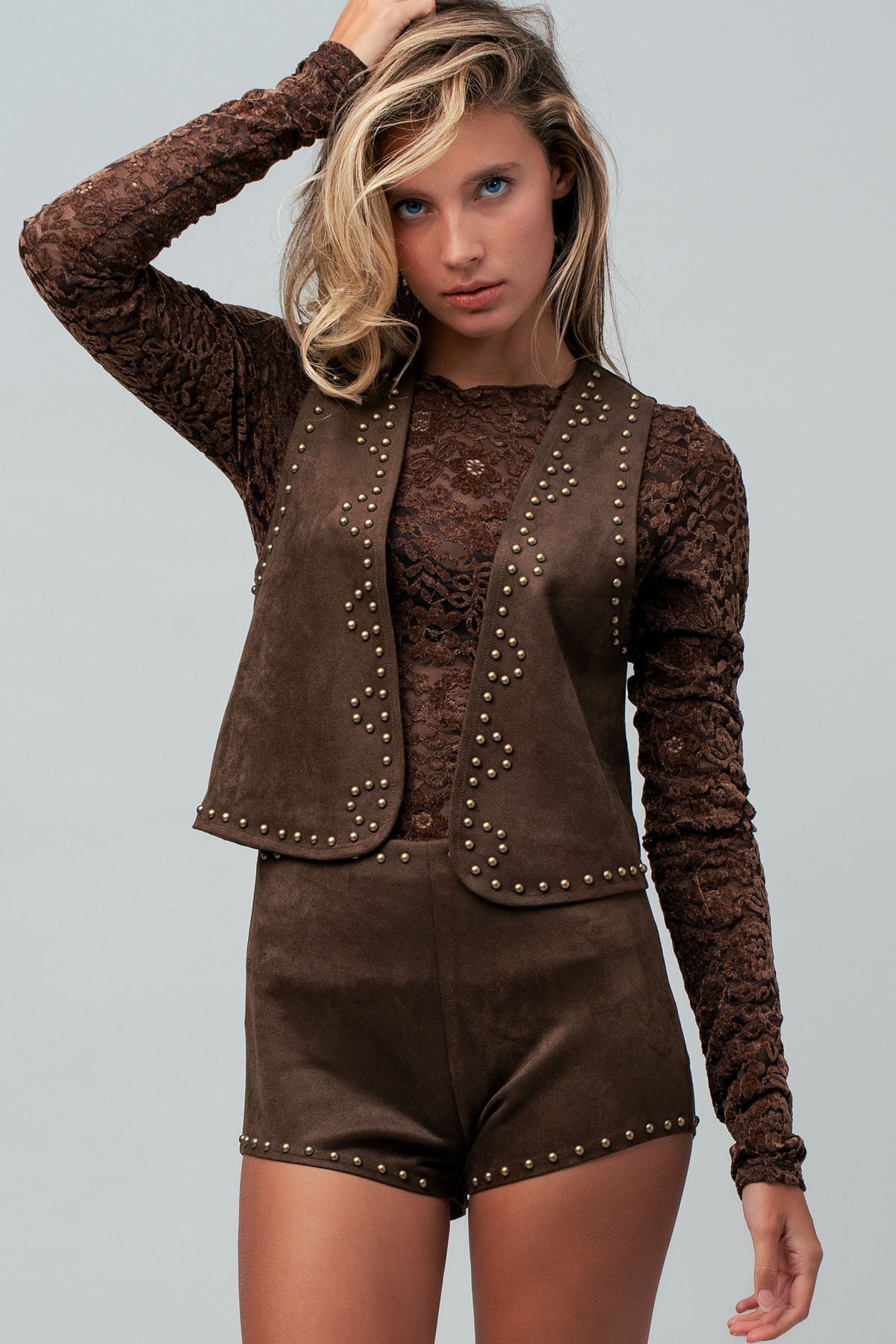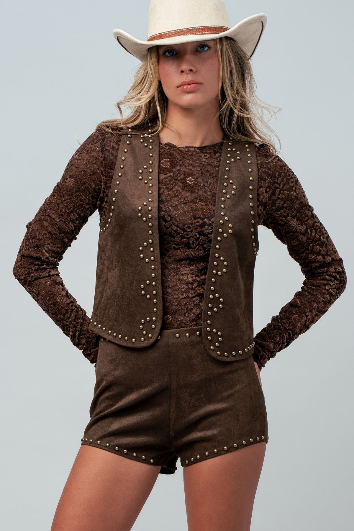 A soft, Western-inspired suede vest elevated with intricate stud detailing bringing a touch of bold character to any look.