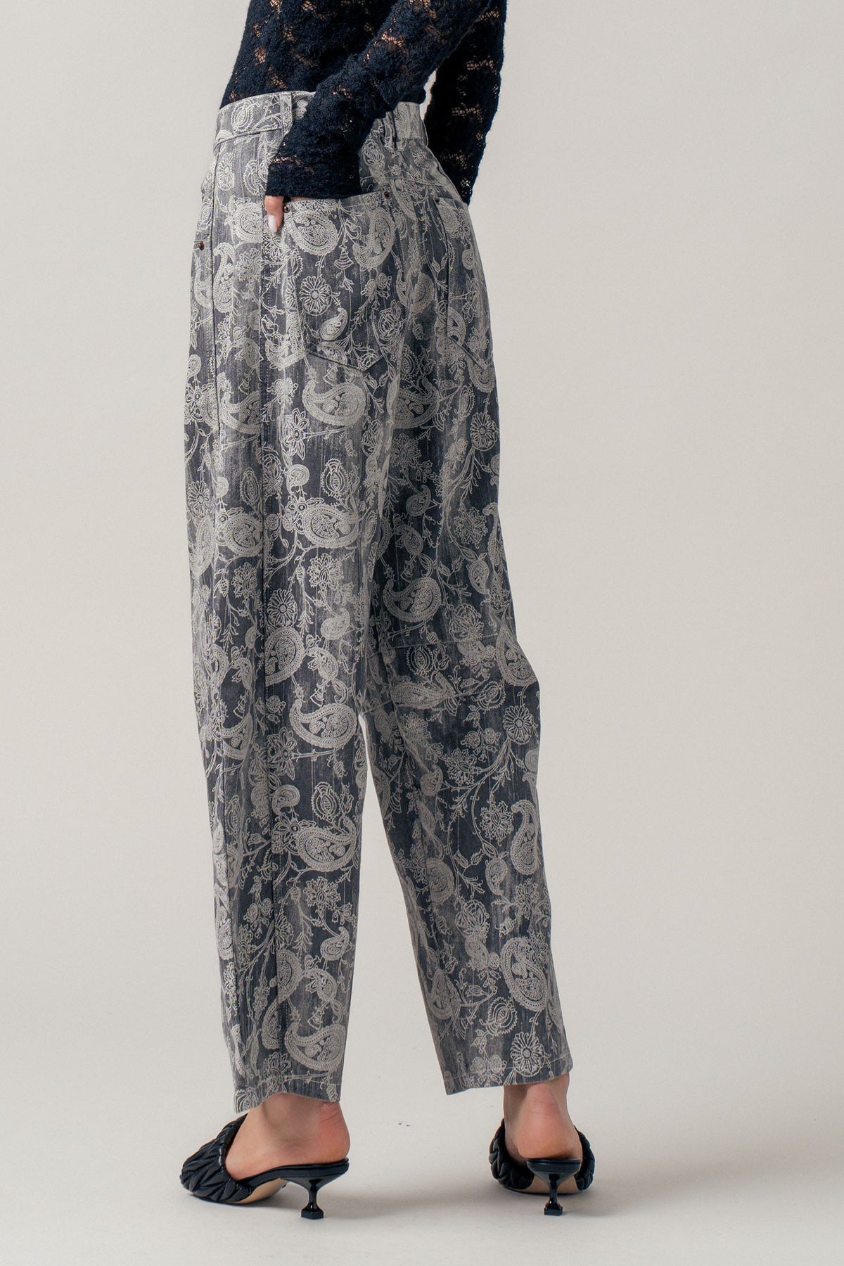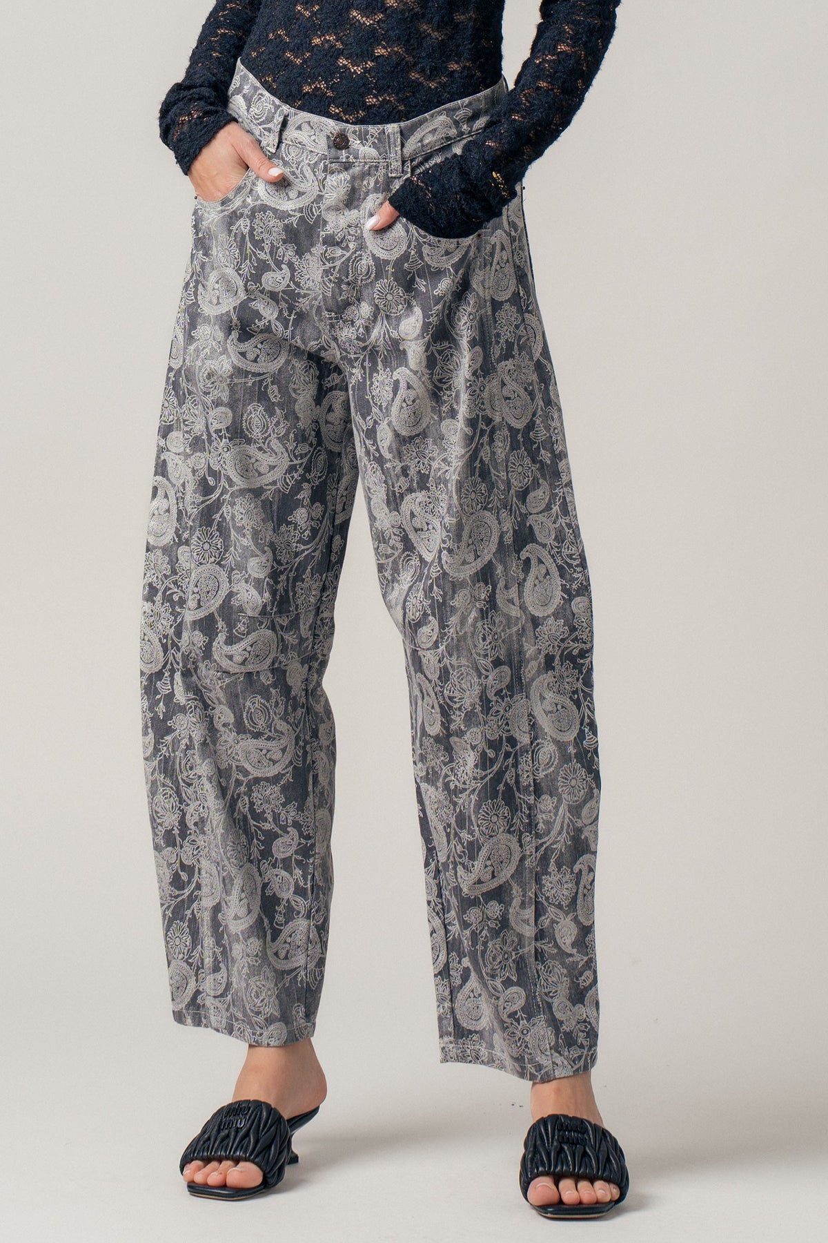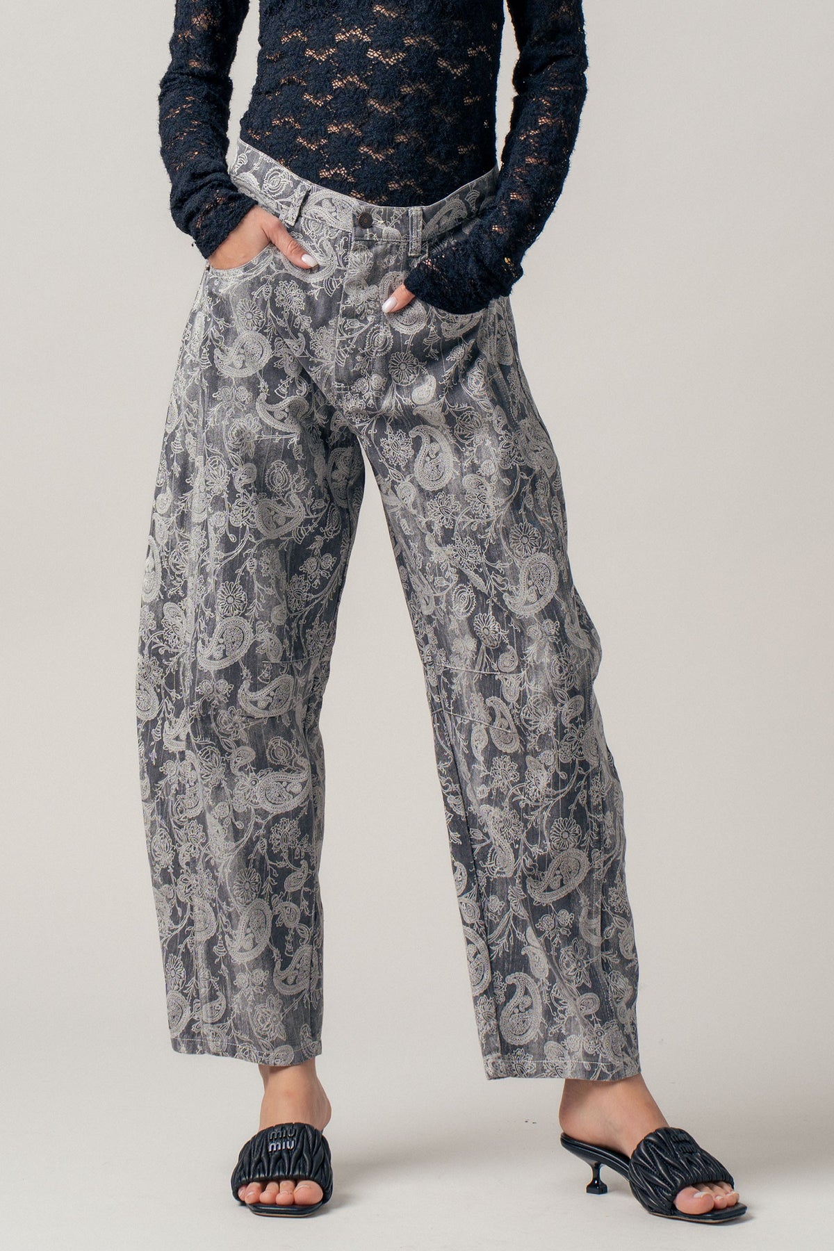 The perfect statement-maker! This bold pair adds a fun, on-trend silhouette to your denim collection. The monochrome paisley print brings a chic pop, while the relaxed leg and subtle taper keep the look modern and flattering-perfect with a fitted basic tee, cami, silky tank, or a cropped sweater all year long.