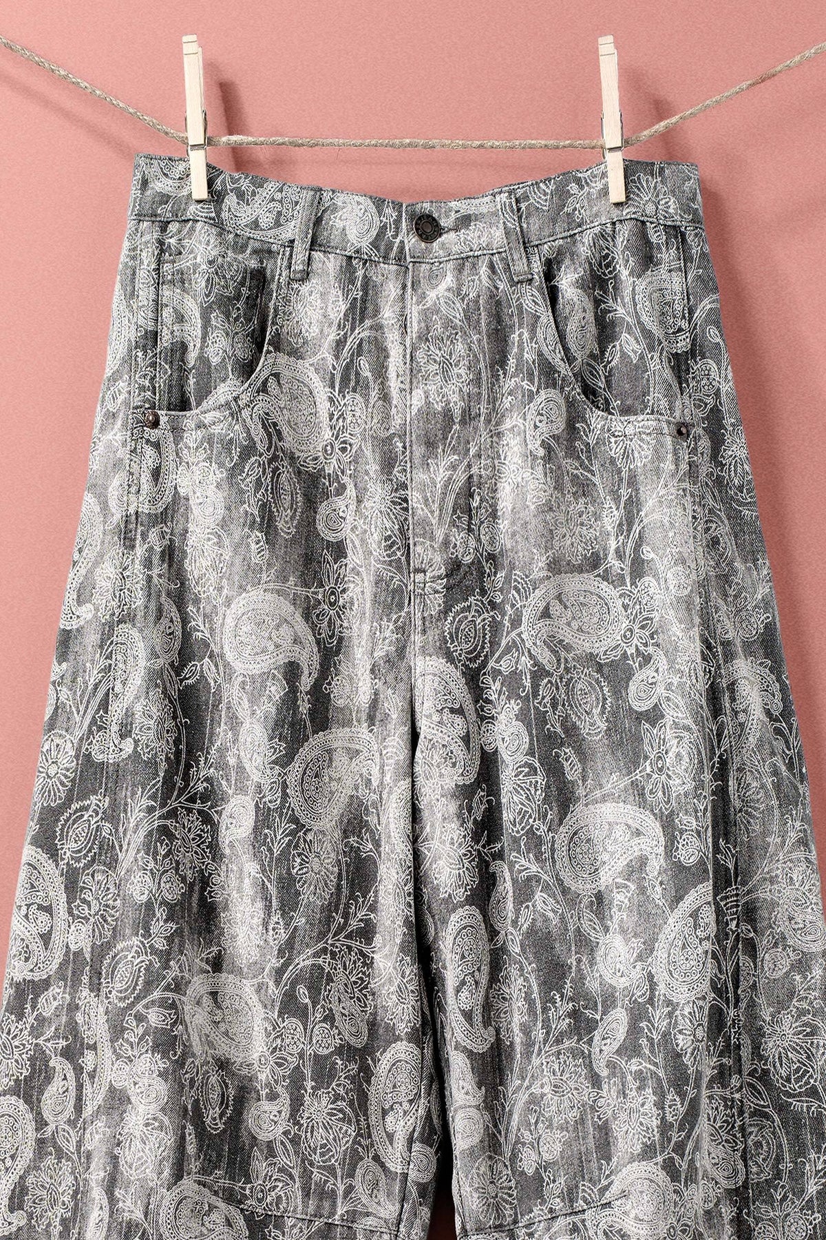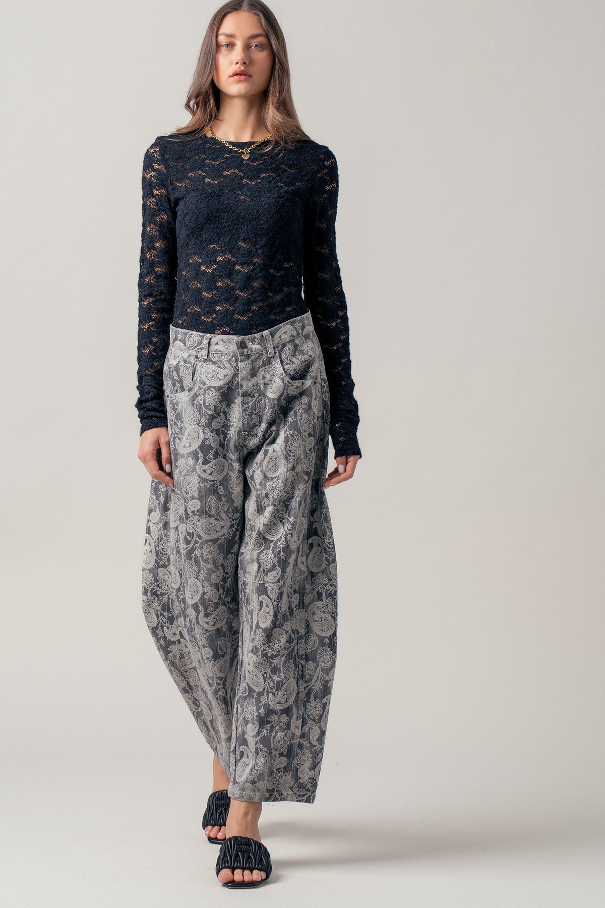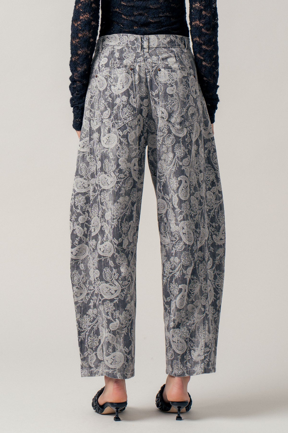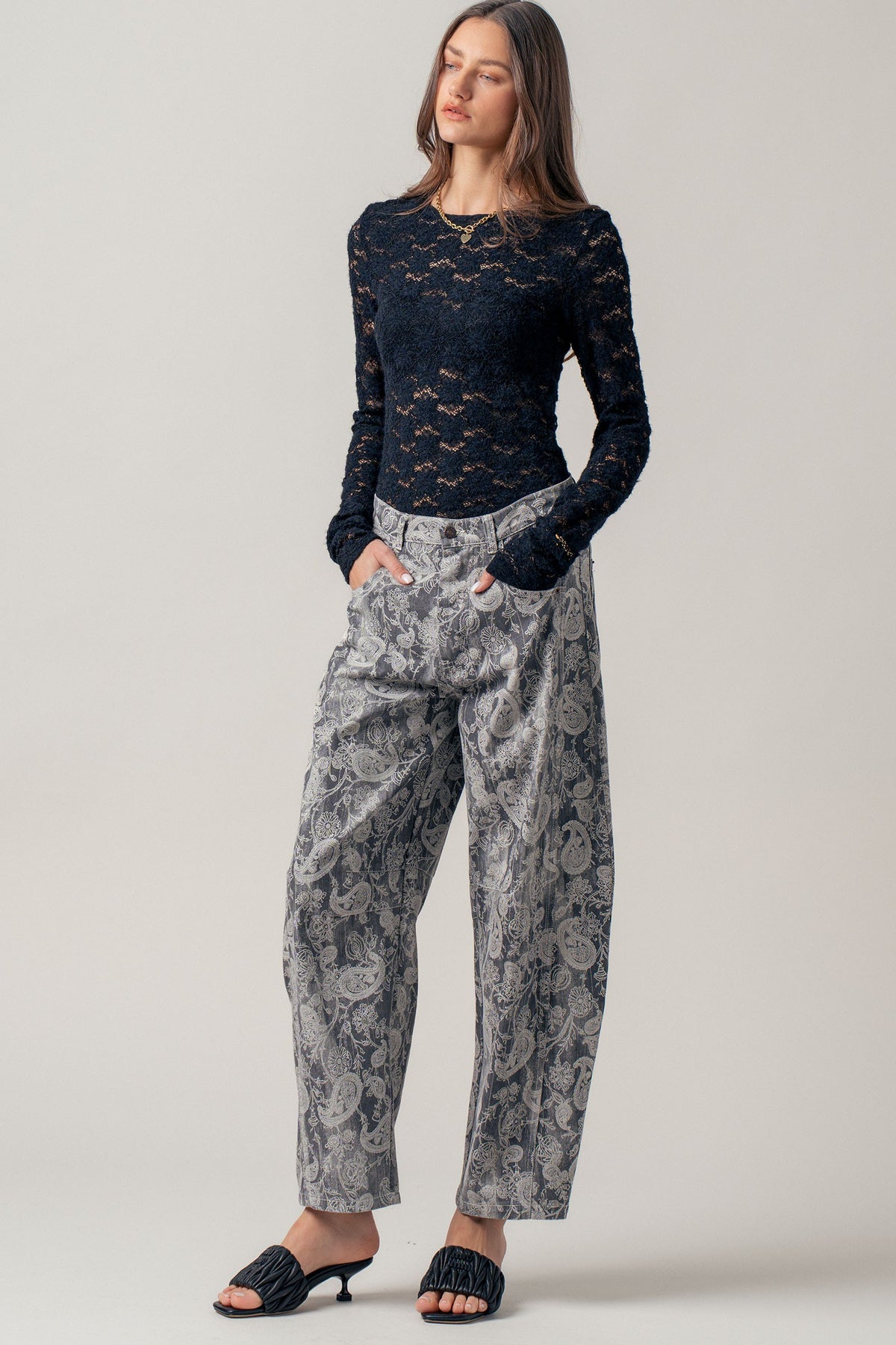 The perfect statement-maker! This bold pair adds a fun, on-trend silhouette to your denim collection. The monochrome paisley print brings a chic pop, while the relaxed leg and subtle taper keep the look modern and flattering-perfect with a fitted basic tee, cami, silky tank, or a cropped sweater all year long.