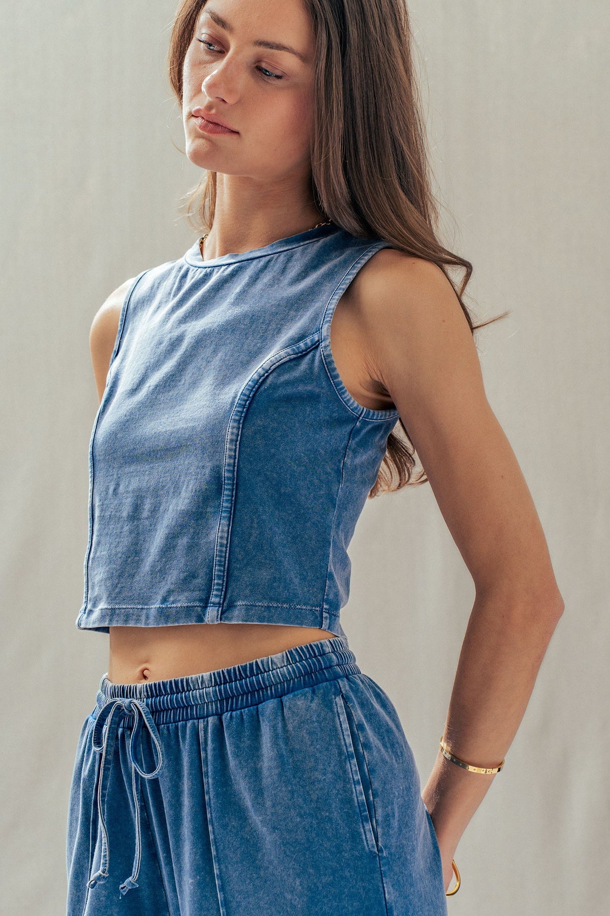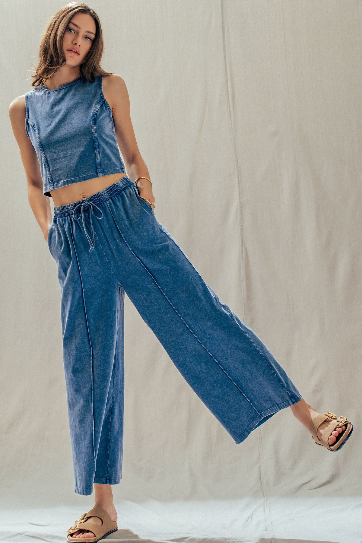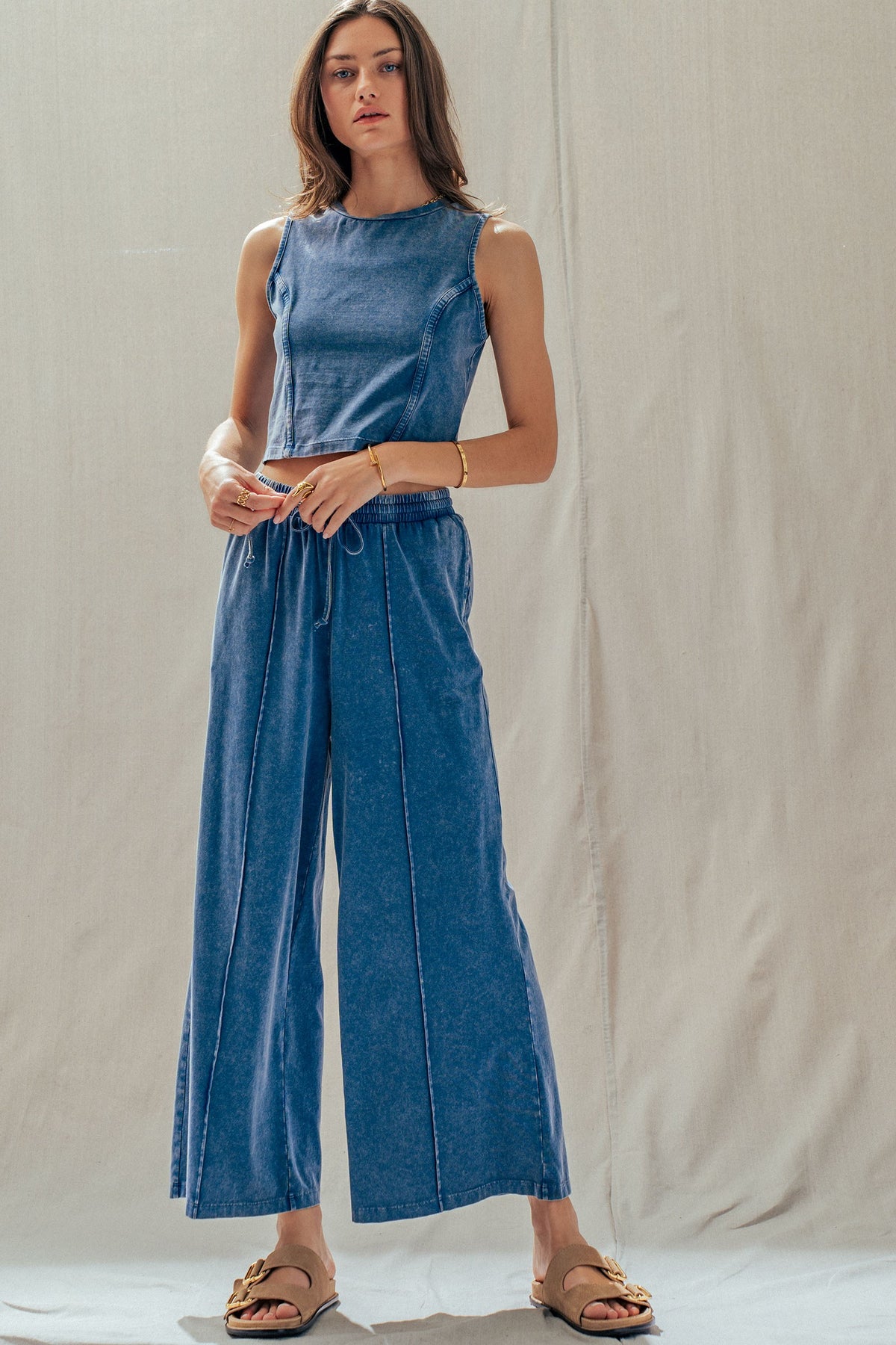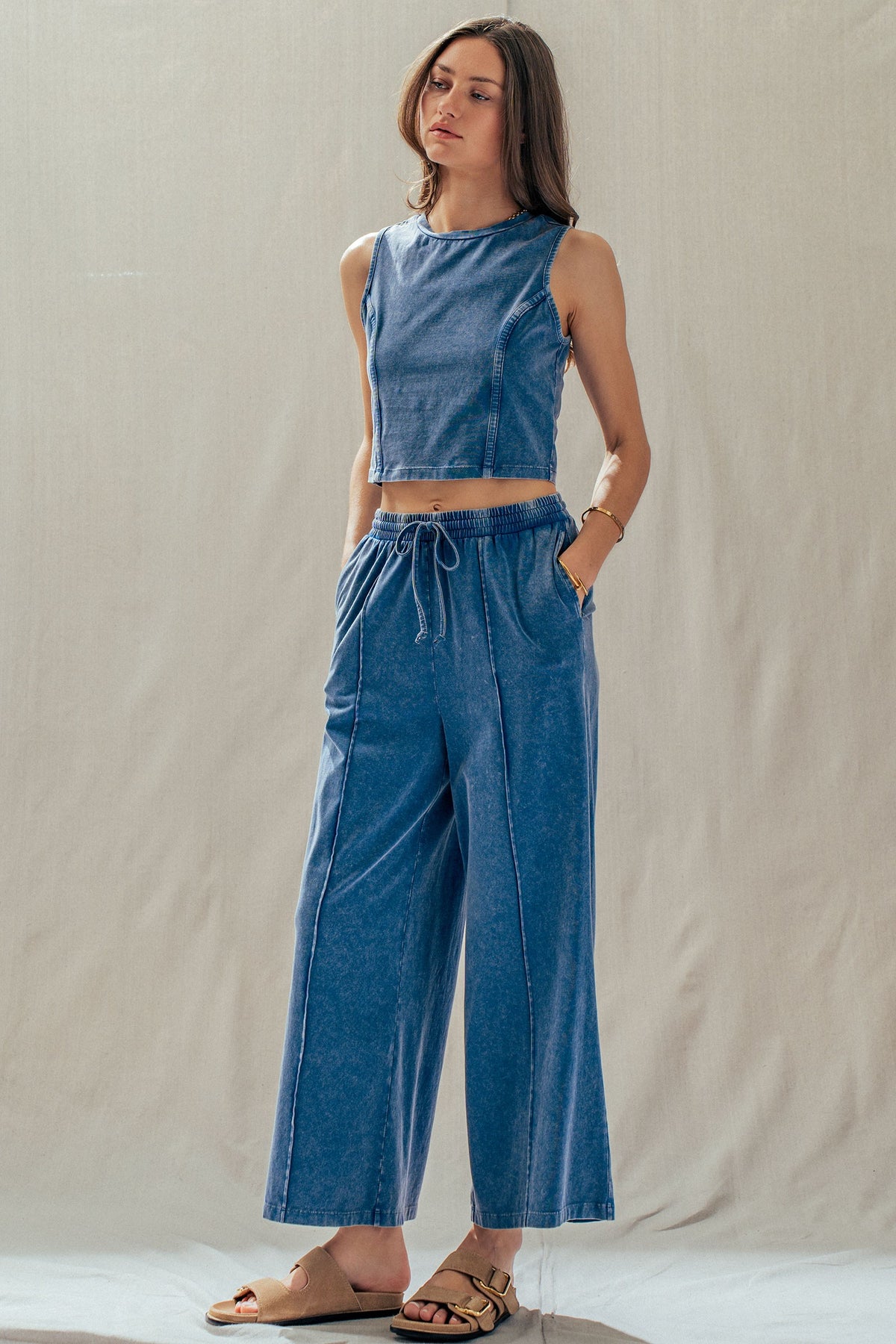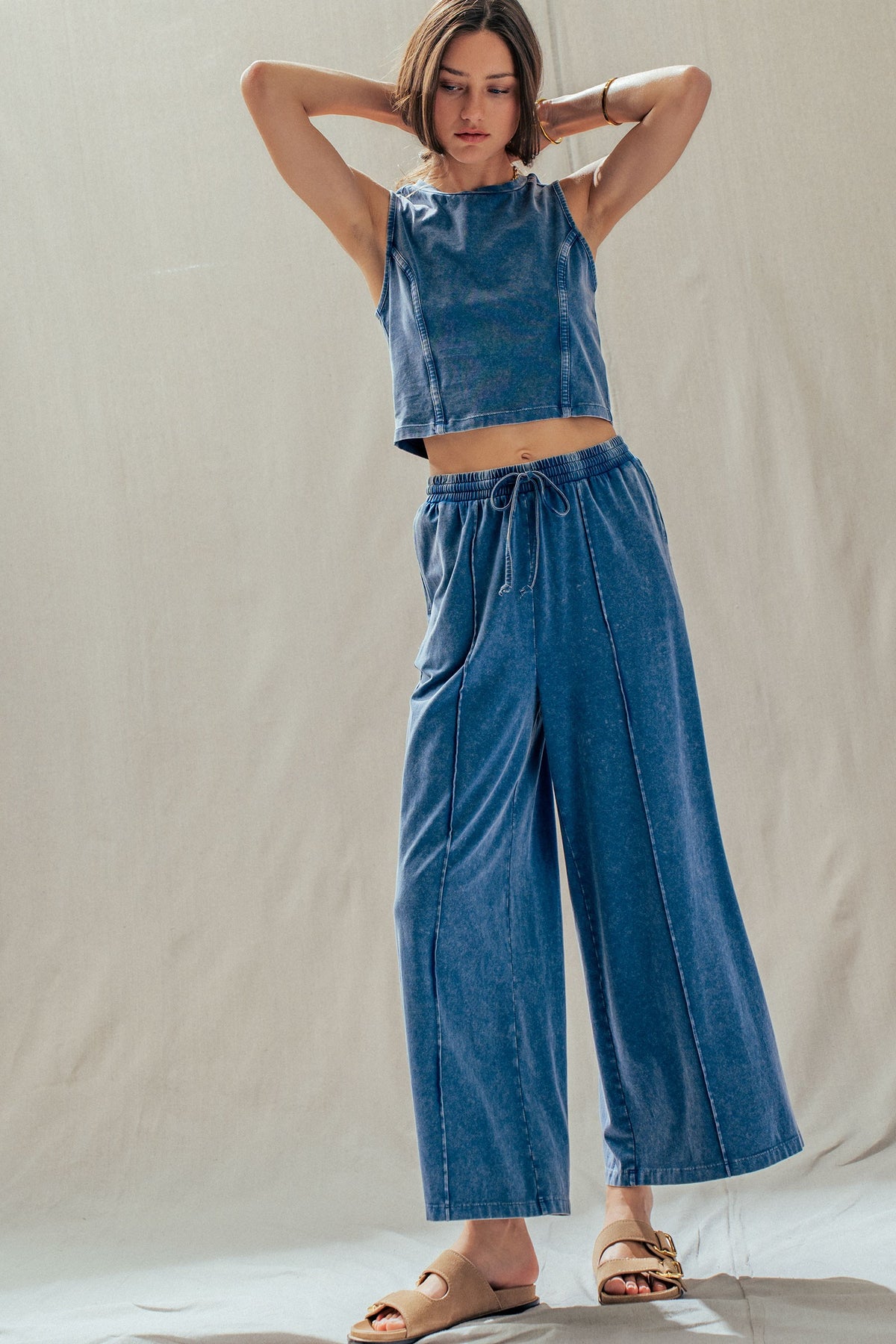 A relaxed two-piece set made from soft, stretch-kissed cotton, featuring a sleeveless, seam-detailed top and easy wide-leg pants with a drawstring waist. Effortlessly chic worn together or styled separately-pair the pants with a tank or graphic tee, or style the top with track pants for an off-duty look.