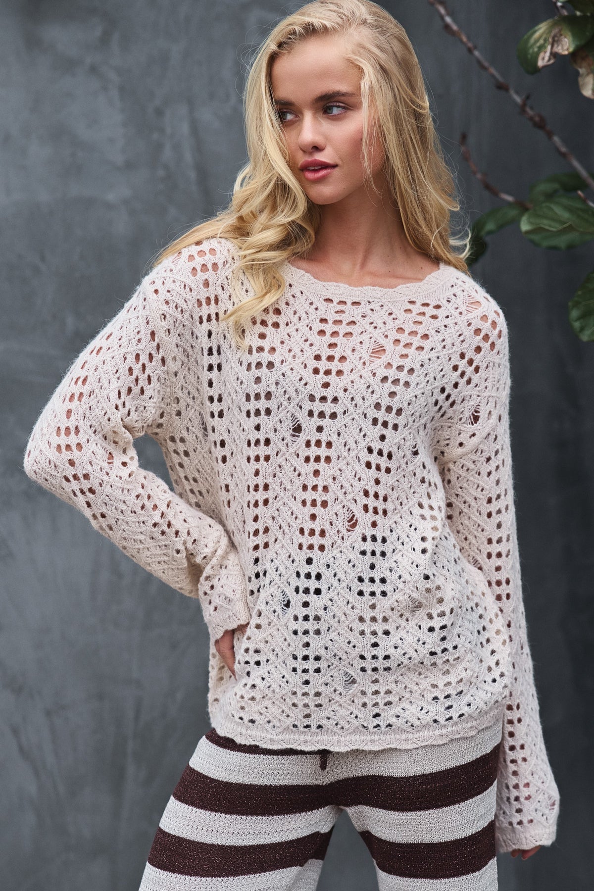 Fit: Relaxed, slightly boxy fit with dropped shoulders and a straight hem. Semi-sheer open-knit allows for layering versatility.