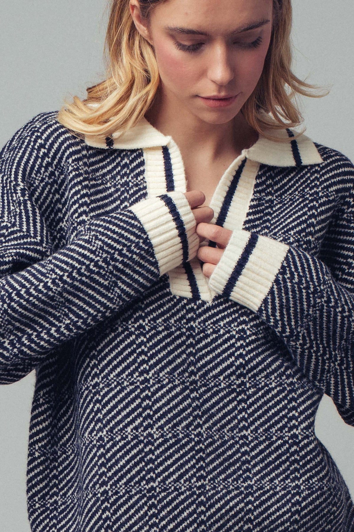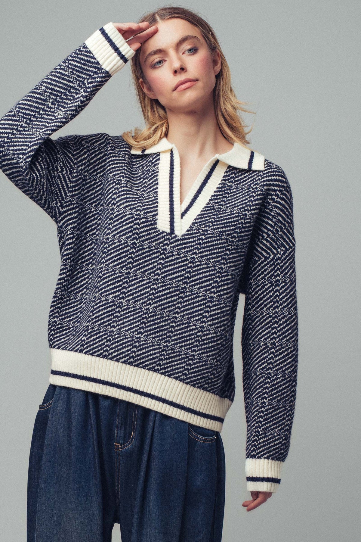 Modern yet timeless, this knit polo sweater blends classic tailoring with a cozy twist. Perfect for transitional layering and off-duty chic.
