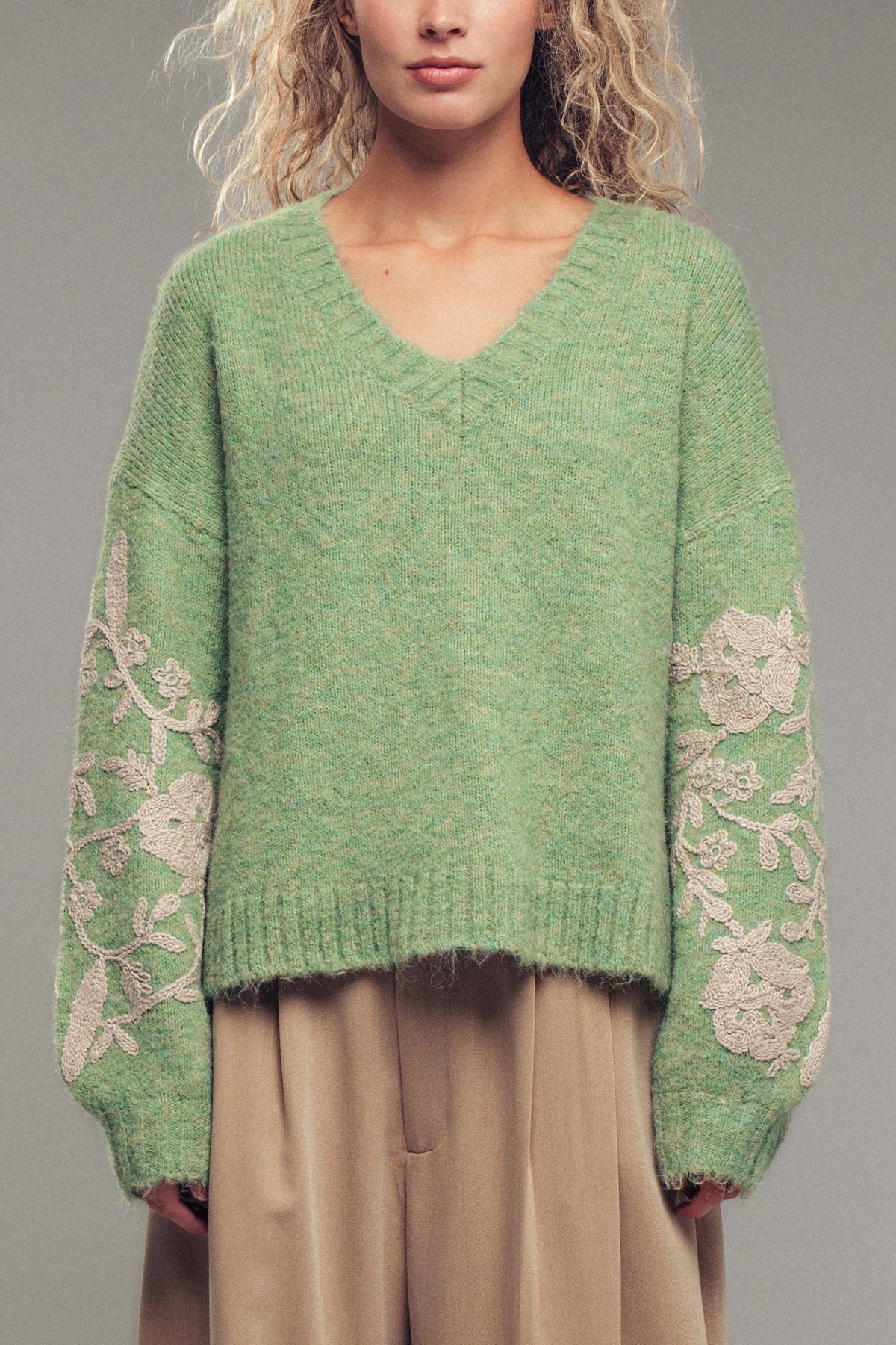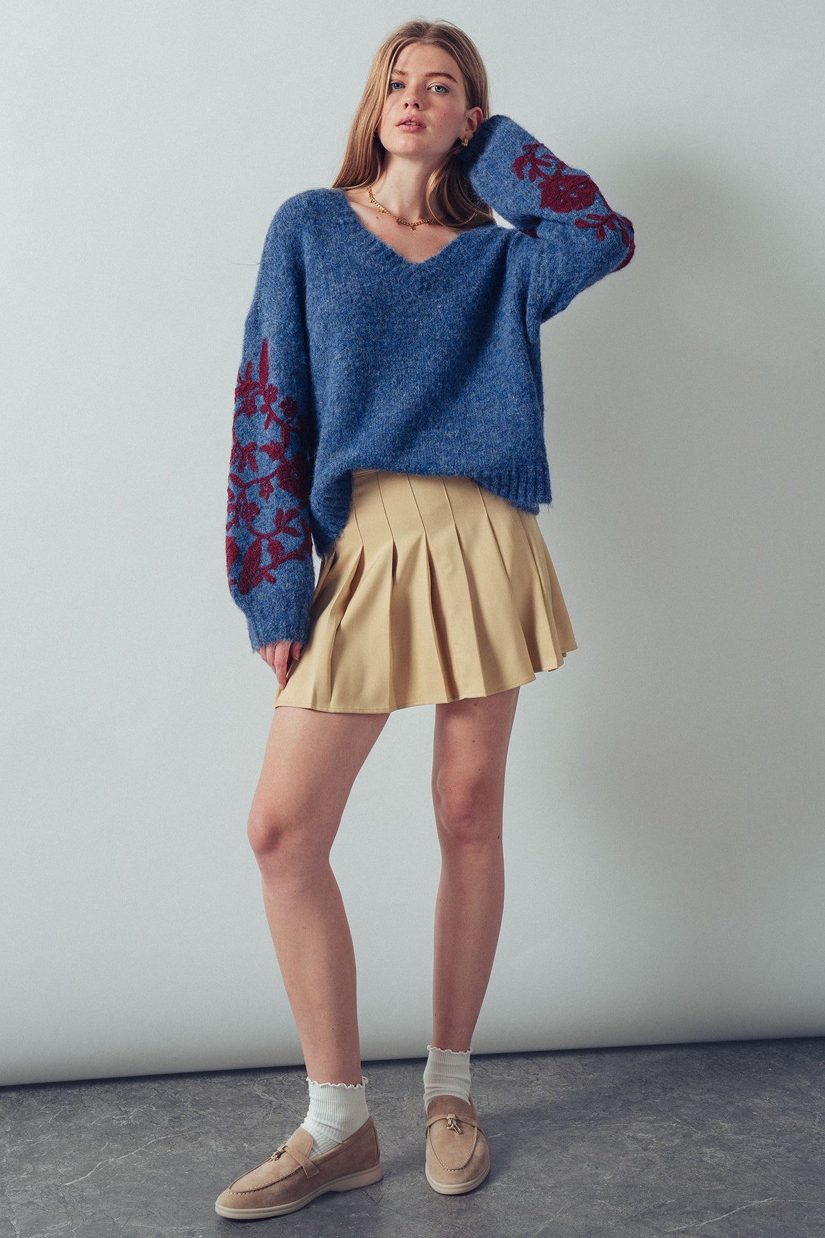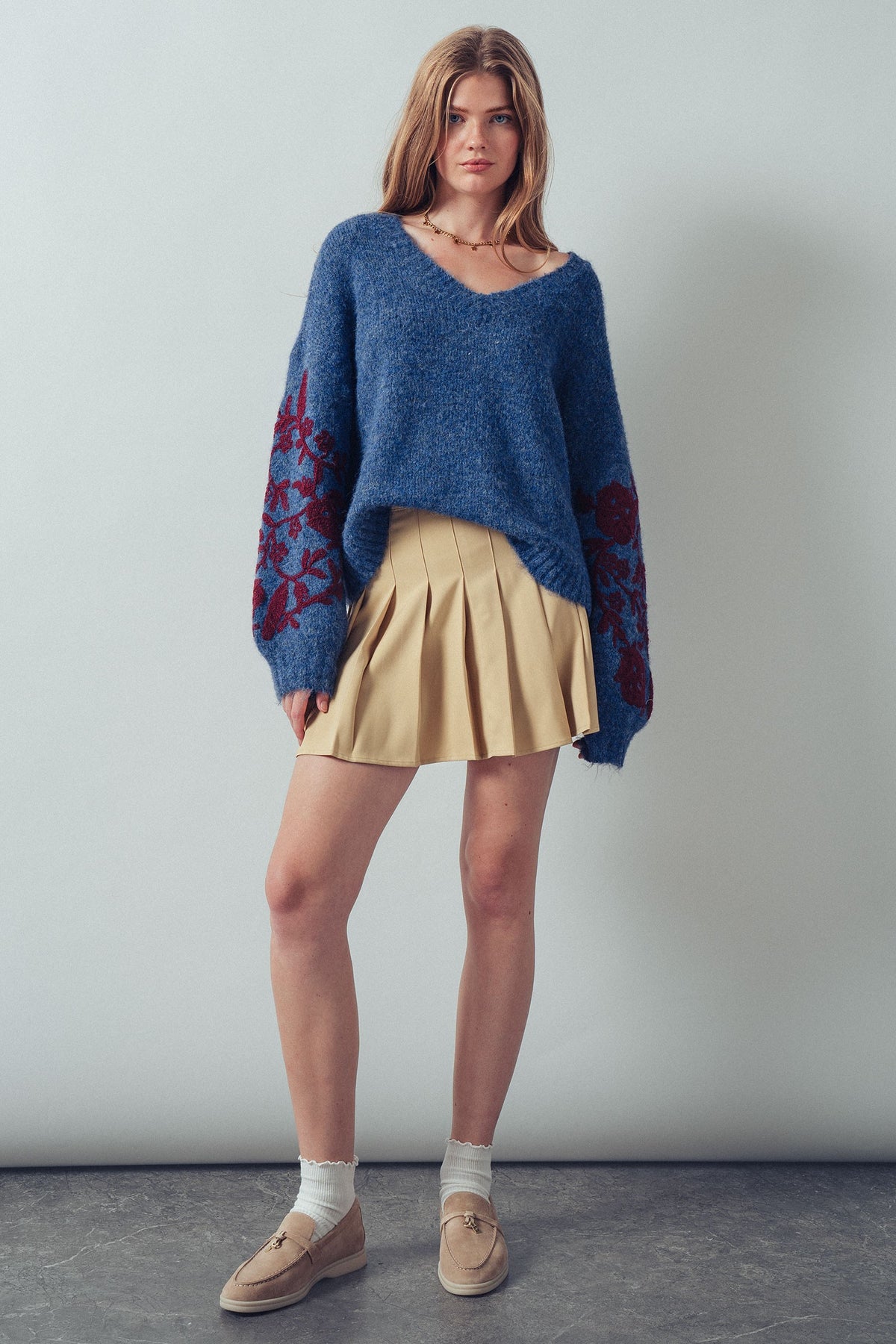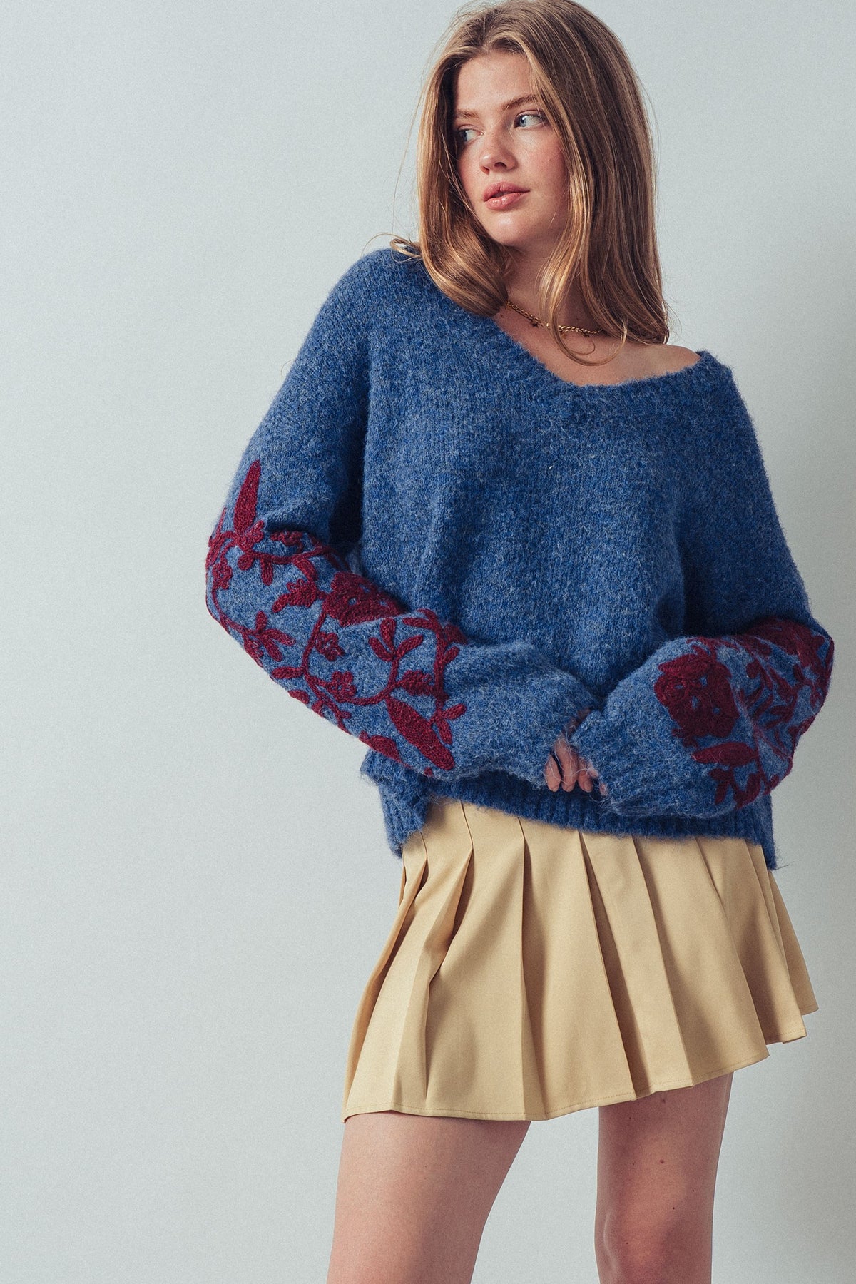 This cozy V-neck sweater is crafted from a plush blue knit, detailed with bold burgundy floral embroidery along the voluminous sleeves. The soft texture and relaxed drop-shoulder fit give it a lived-in, effortless appeal, while the deep neckline adds a flattering feminine edge.