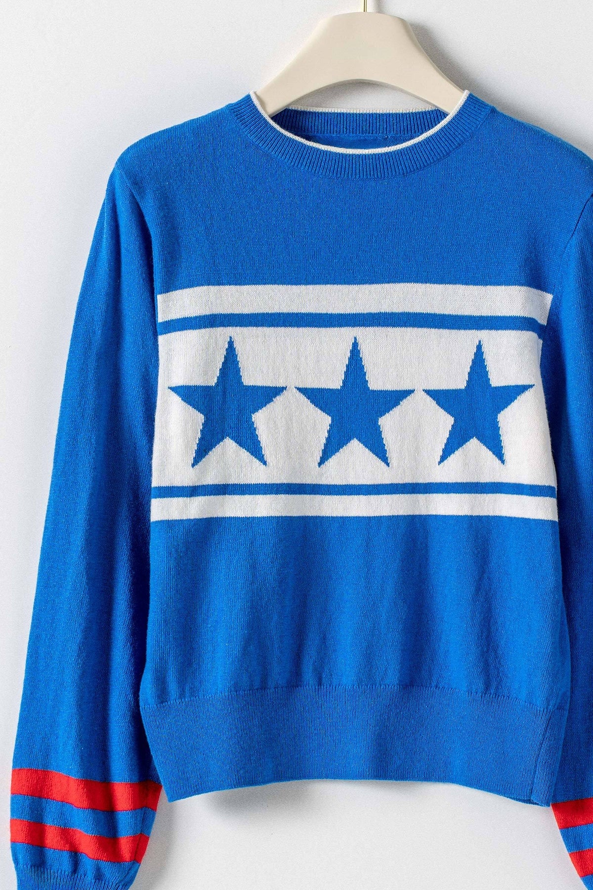 A bold yet playful knit sweater featuring a classic star motif across the chest. Designed in a soft, smooth knit, this piece balances graphic charm with everyday ease, while contrast stripe accents at the sleeves add a sporty, western retro-inspired touch. Perfect for pairing with denim or relaxed trousers for an effortlessly cool look.