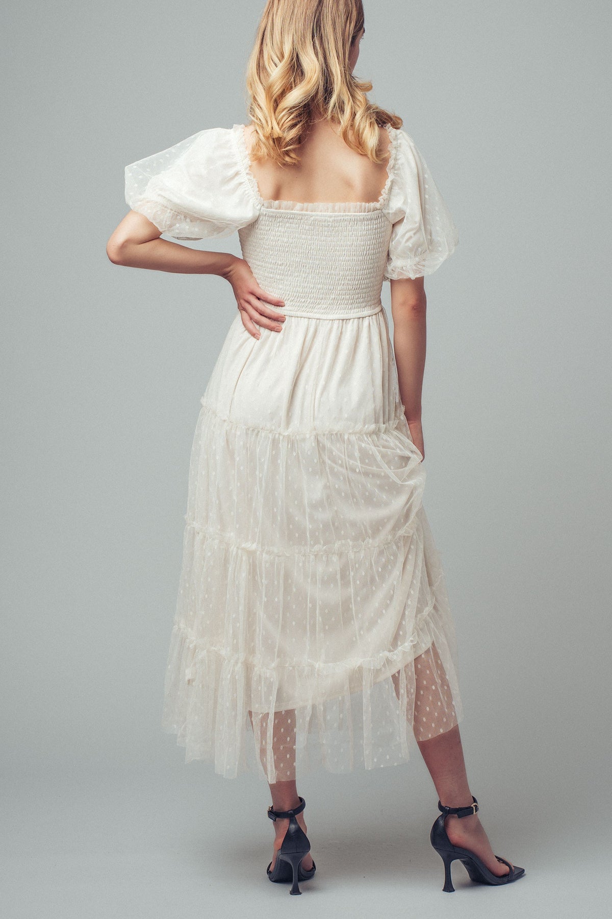 A dreamy, feminine piece that feels timeless yet effortless, this dress is defined by its delicate texture and romantic silhouette.