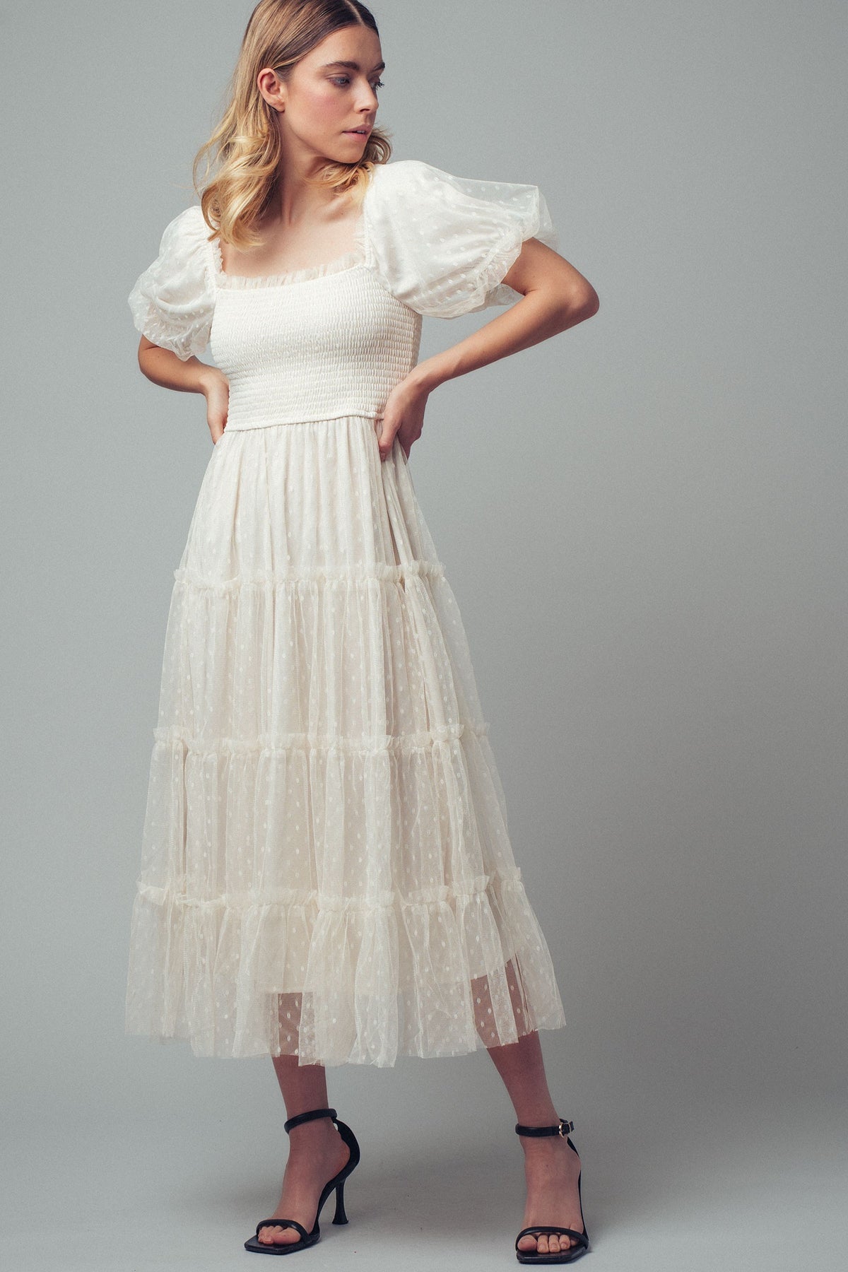A dreamy, feminine piece that feels timeless yet effortless, this dress is defined by its delicate texture and romantic silhouette.