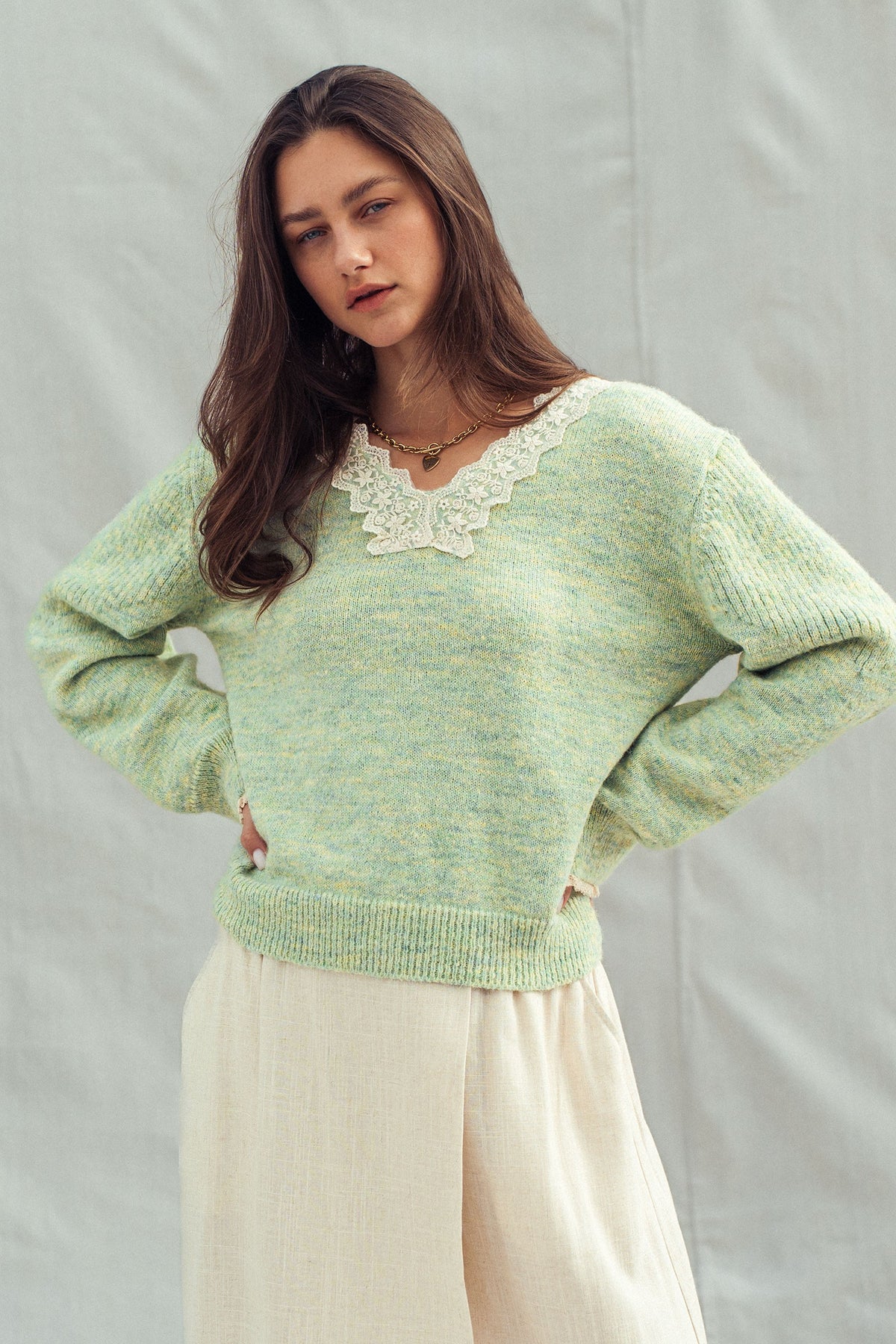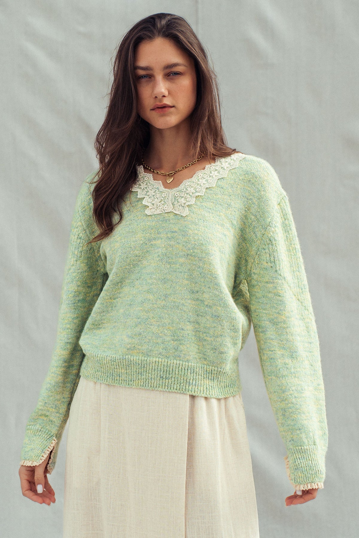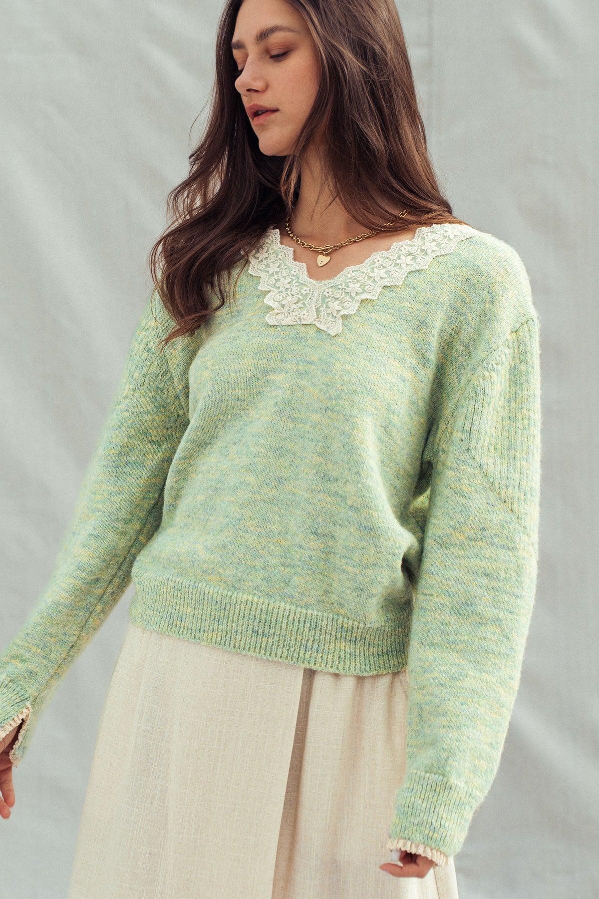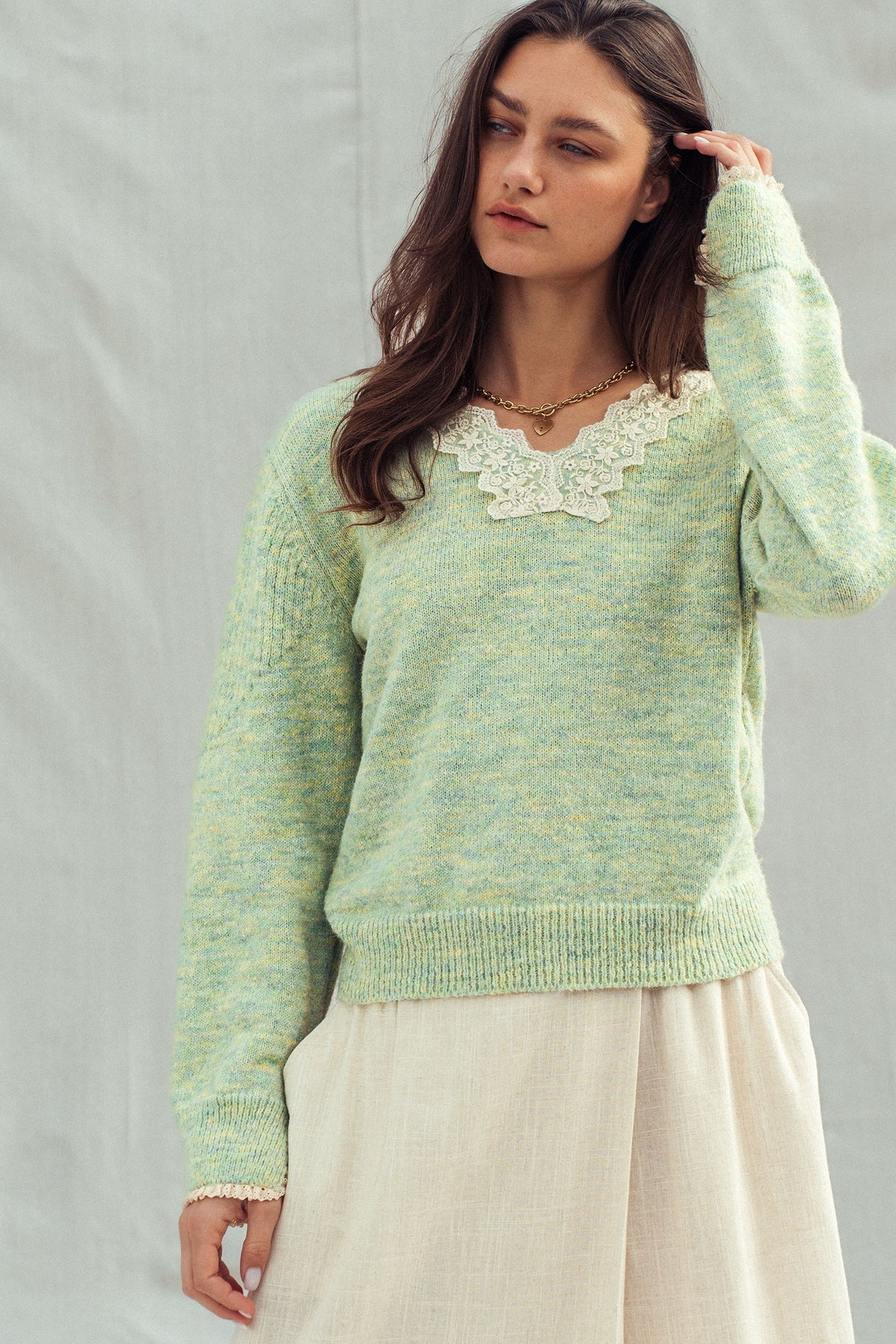 • Delicate lace trim along the V neckline for an elevated, vintage-inspired finish