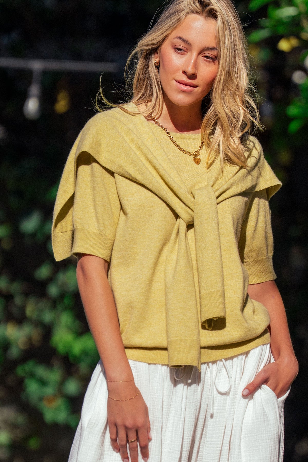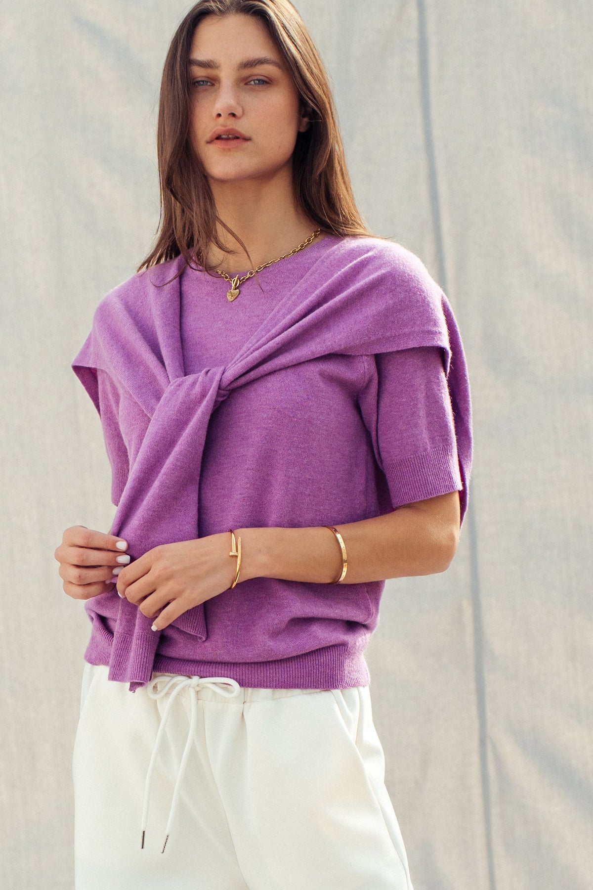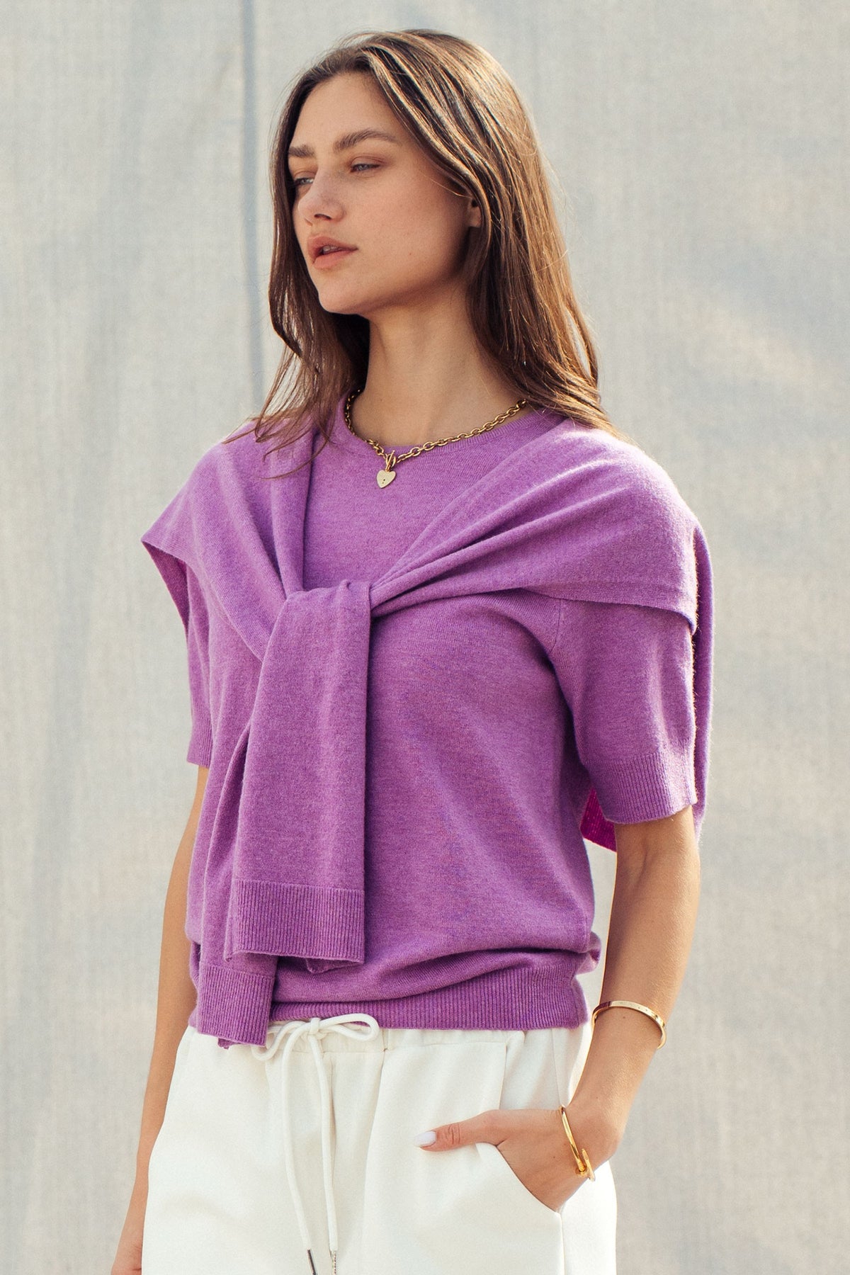 A polished knit top with a built-in layered look. Designed with an attached sweater drape and shoulder-tie detail, this piece gives effortless "styled" vibes with no extra styling required. It pairs perfectly with denim, trousers, or a flowy skirt for a classic, old-money-inspired chic look.