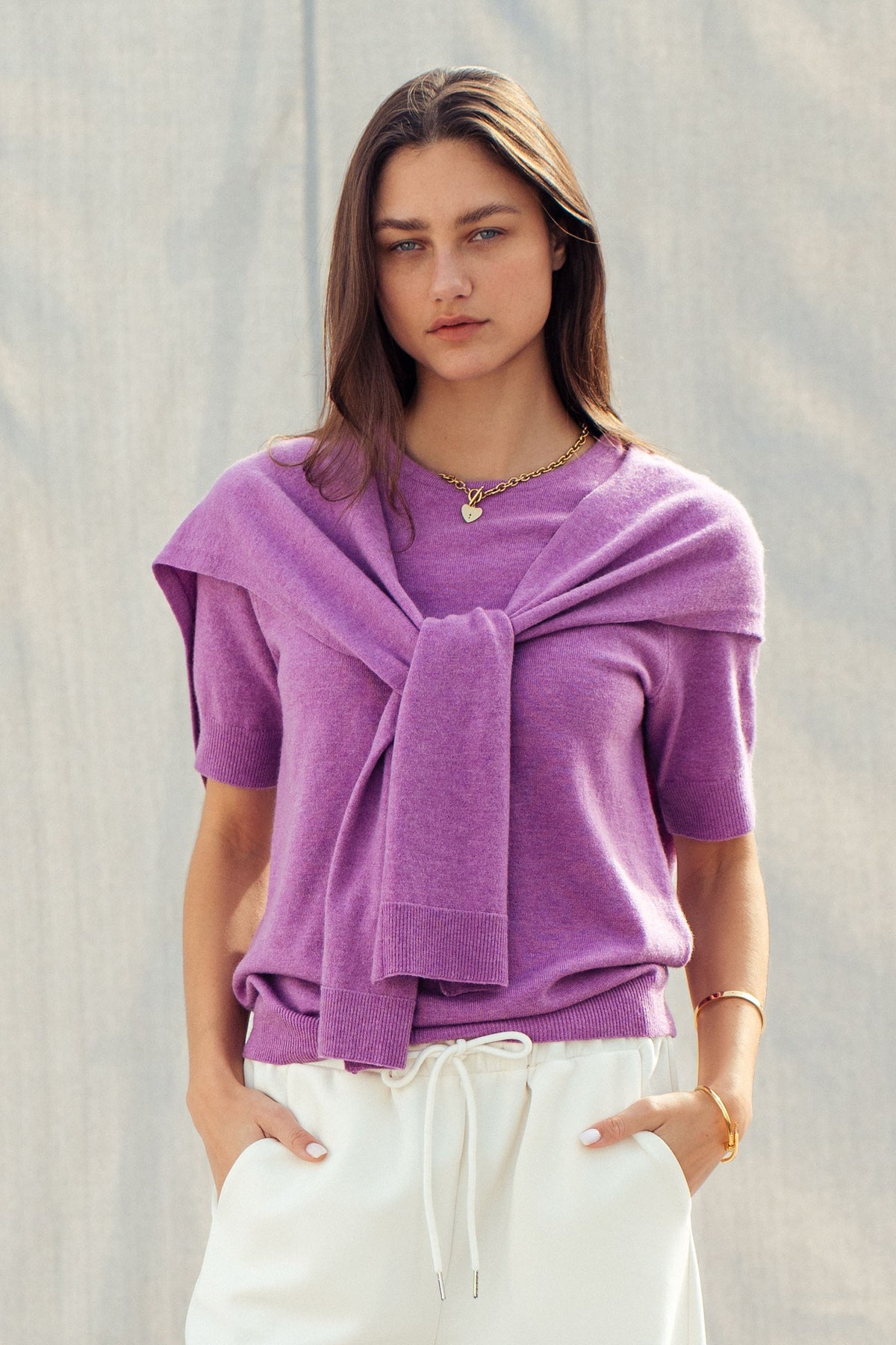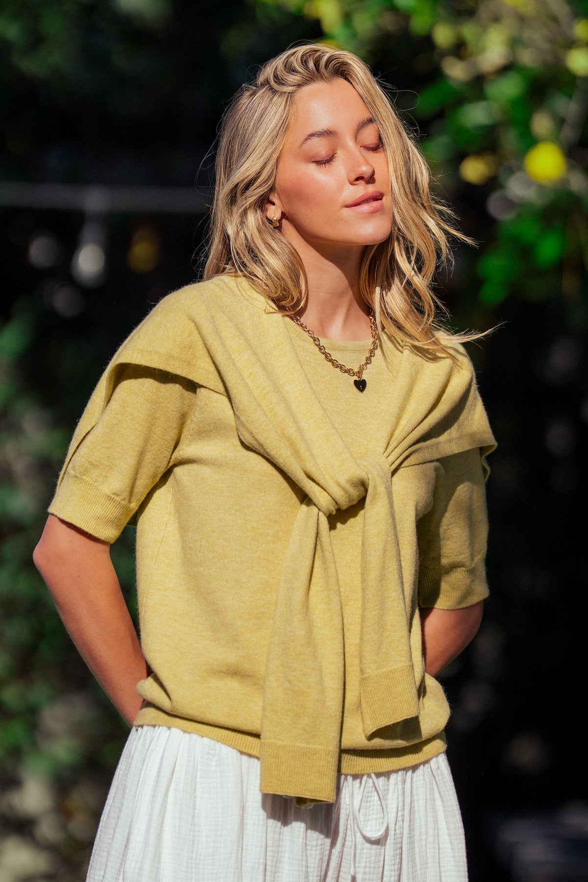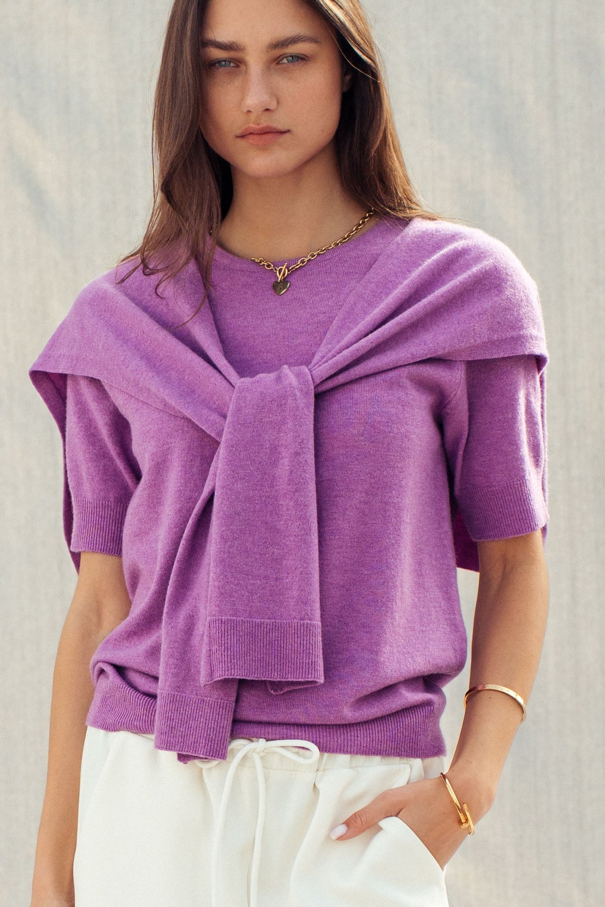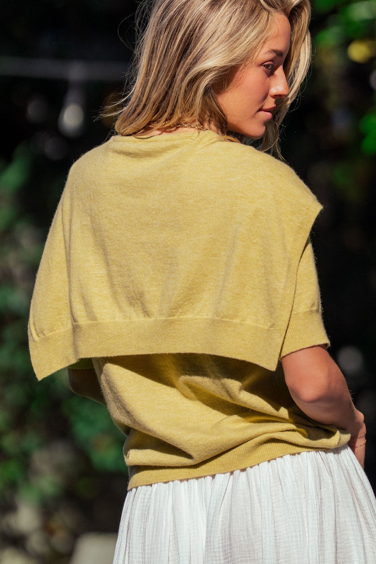 A polished knit top with a built-in layered look. Designed with an attached sweater drape and shoulder-tie detail, this piece gives effortless "styled" vibes with no extra styling required. It pairs perfectly with denim, trousers, or a flowy skirt for a classic, old-money-inspired chic look.