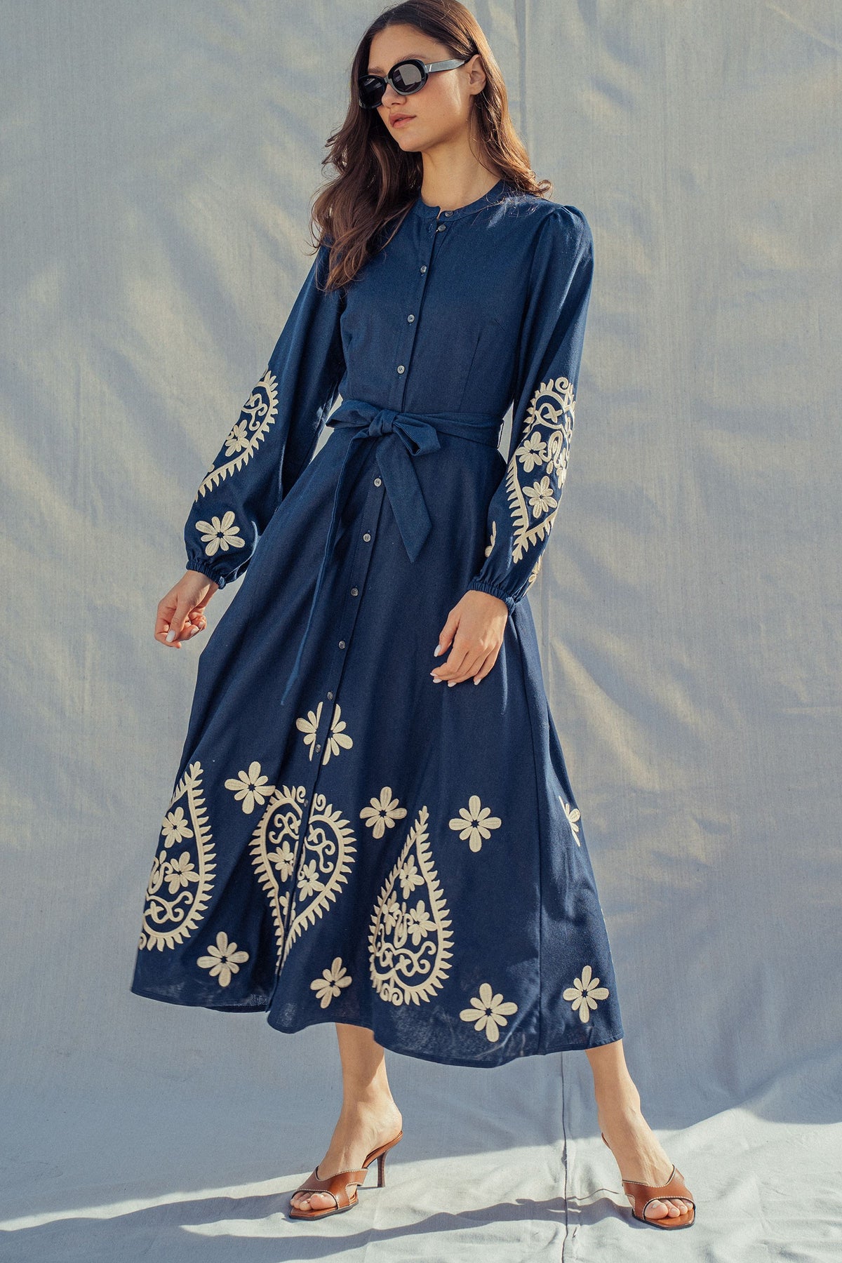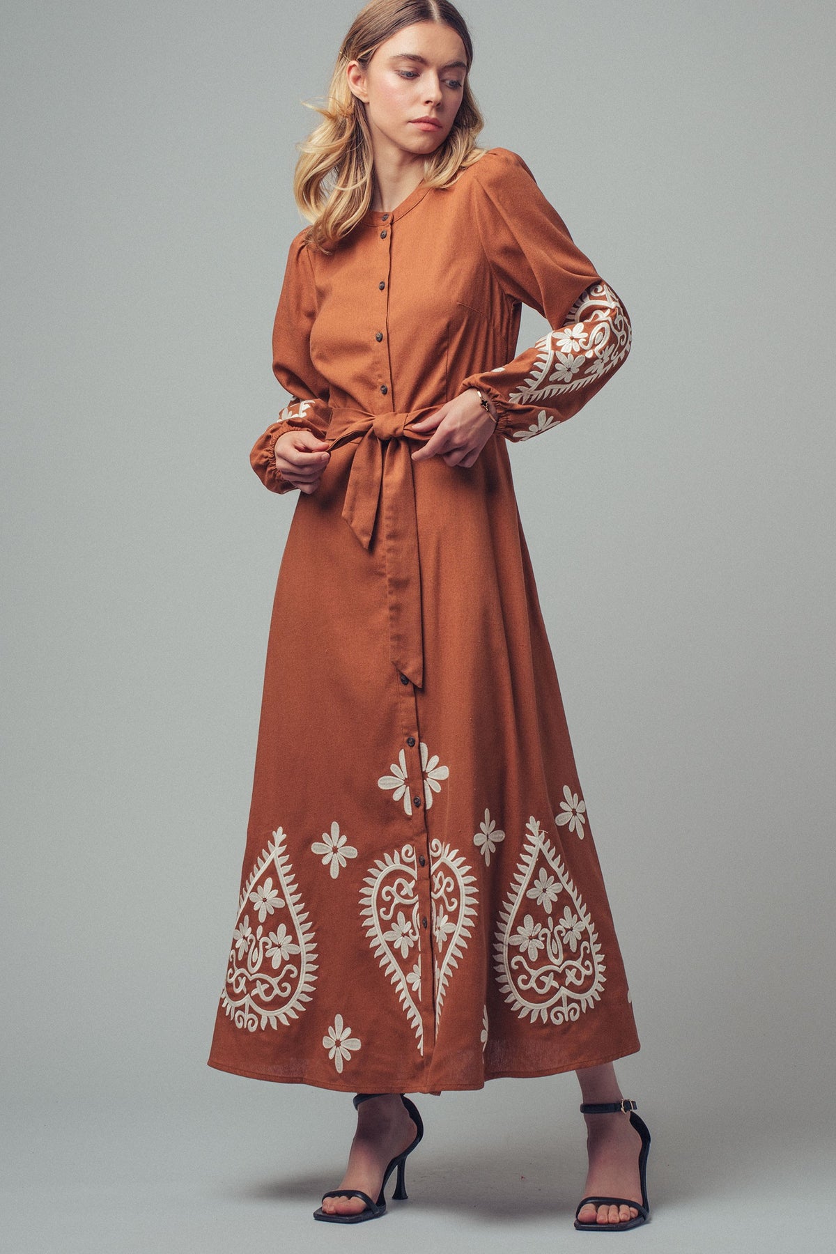 Crafted from lightweight cotton with bold paisley embroidery, this maxi dress delivers an artisanal touch with everyday ease. The belted waist and flowing skirt create a flattering, feminine silhouette, while button-front details keep it versatile.
