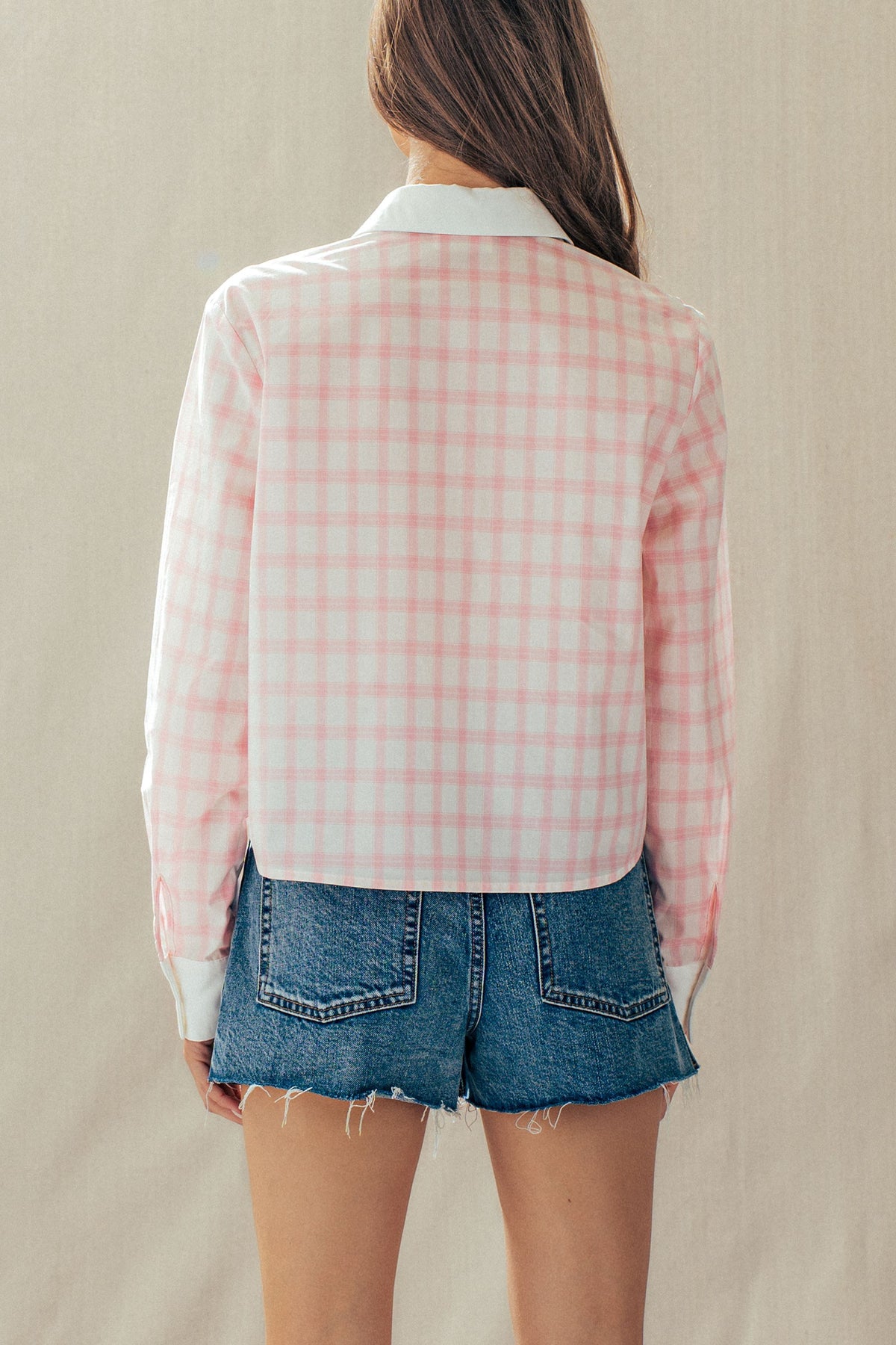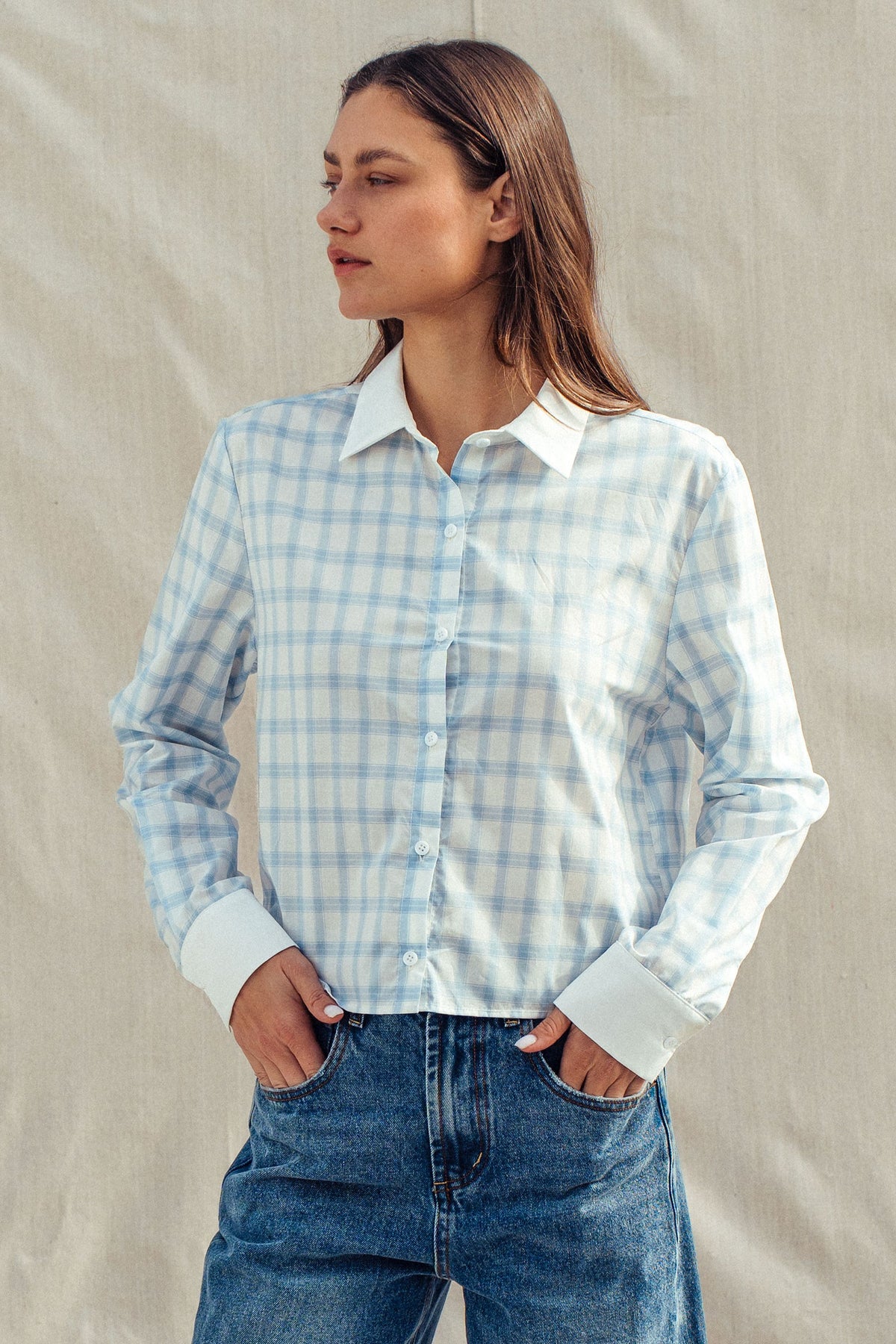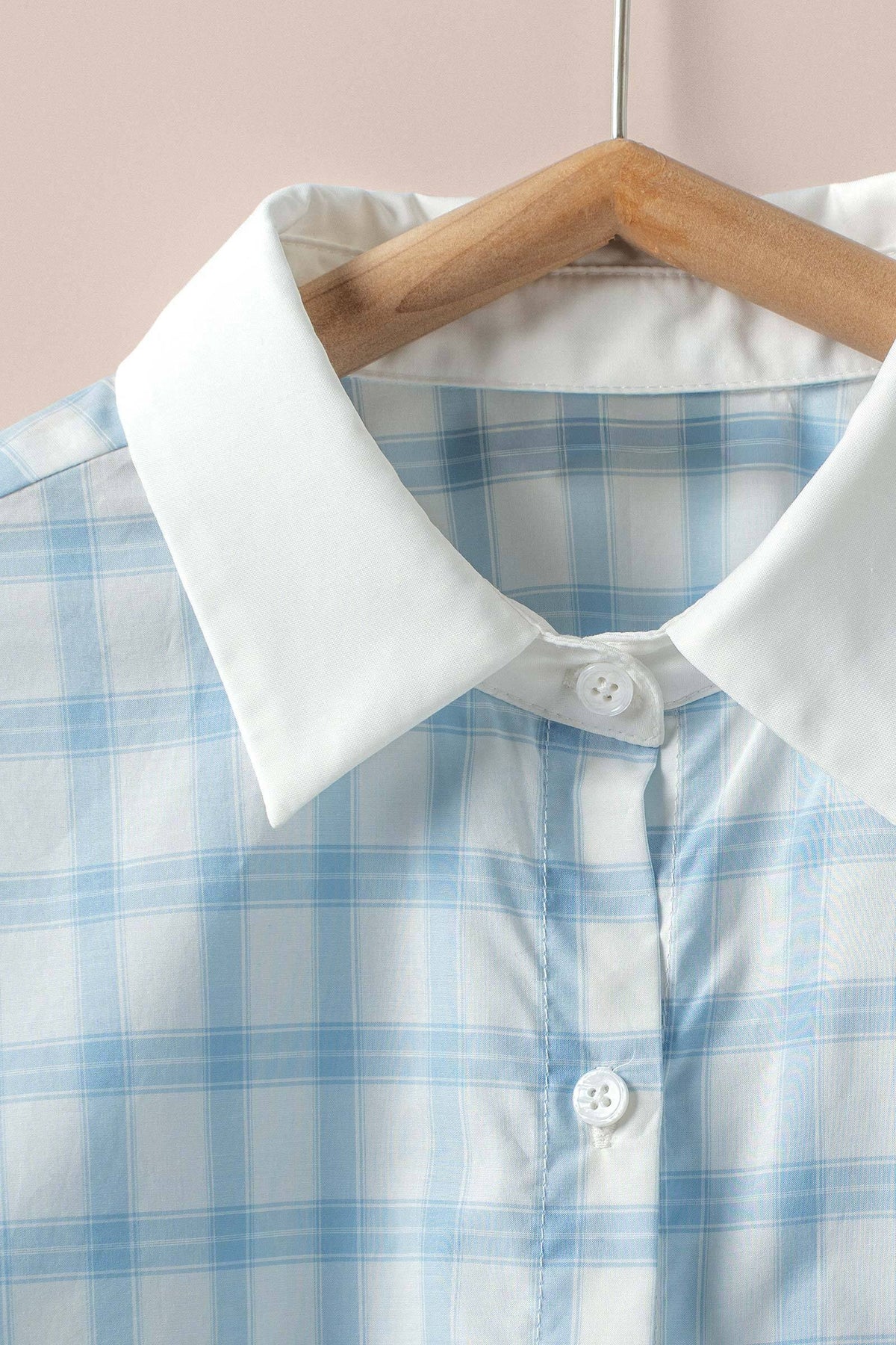 A fresh, polished blouse designed in soft cotton with a crisp white contrast collar and cuffs. Style it tucked into denim shorts or a fun pleated skirt, or wear it loose with your favorite jeans for a relaxed preppy vibe-perfect for warm spring and summer dates, Easter brunch, the office, and sunny day outings.